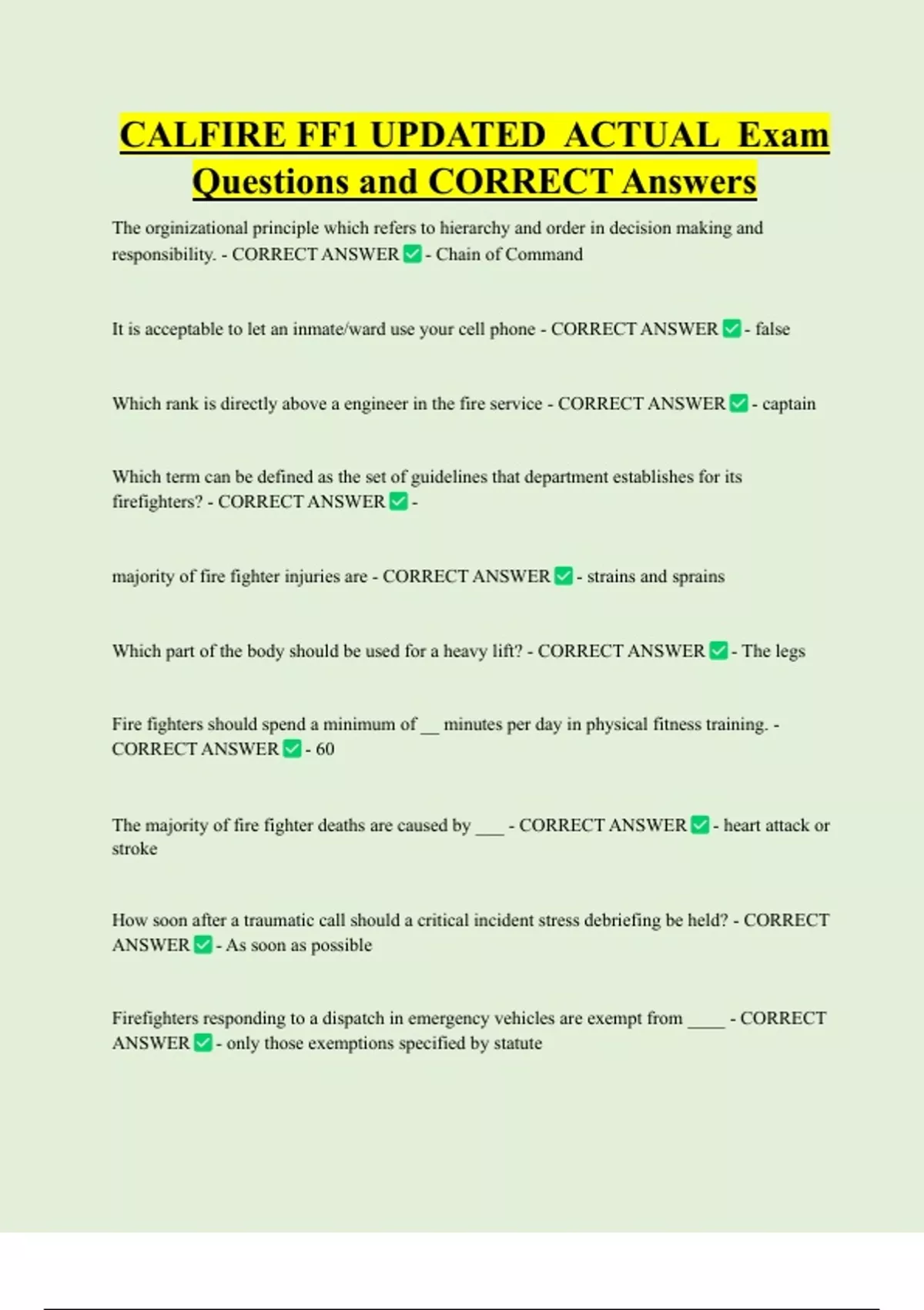 CALFIRE FF1 UPDATED ACTUAL Exam Questions and CORRECT Answers The orginizational principle which refers to hierarchy and order in decision making and responsibility. - CORRECT ANSWER - Chain of Command It is acceptable to let an inmate/ward use your cell phone - CORRECT ANSWER Which rank is directly above a engineer in the fire service - CORRECT ANSWER Which term can be defined as the set of guidelines that department establishes for its firefighters? - CORRECT ANSWER - majority of fire fighter injuries are - CORRECT ANSWER - strains and sprains - false - captain