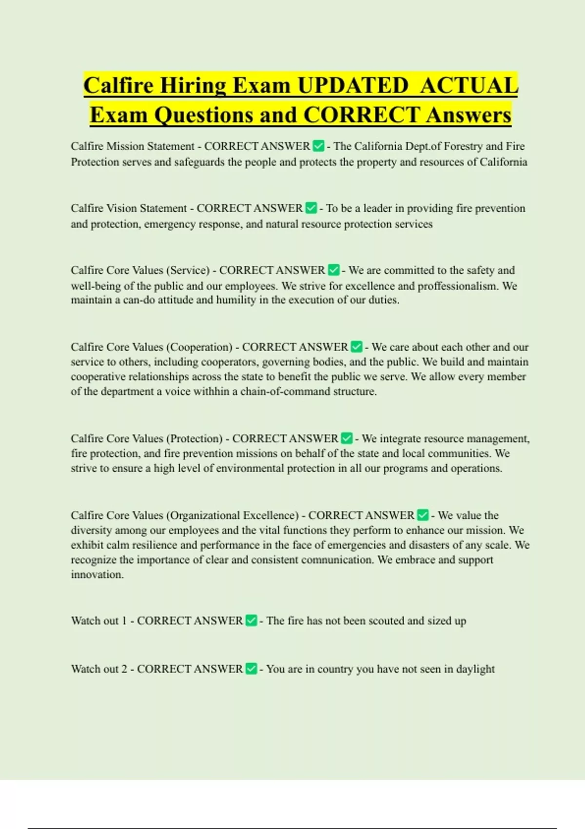Calfire Hiring Exam UPDATED ACTUAL Exam Questions and CORRECT Answers Calfire Mission Statement - CORRECT ANSWER - The California D Forestry and Fire Protection serves and safeguards the people and protects the property and resources of California Calfire Vision Statement - CORRECT ANSWER - To be a leader in providing fire prevention and protection, emergency response, and natural resource protection services