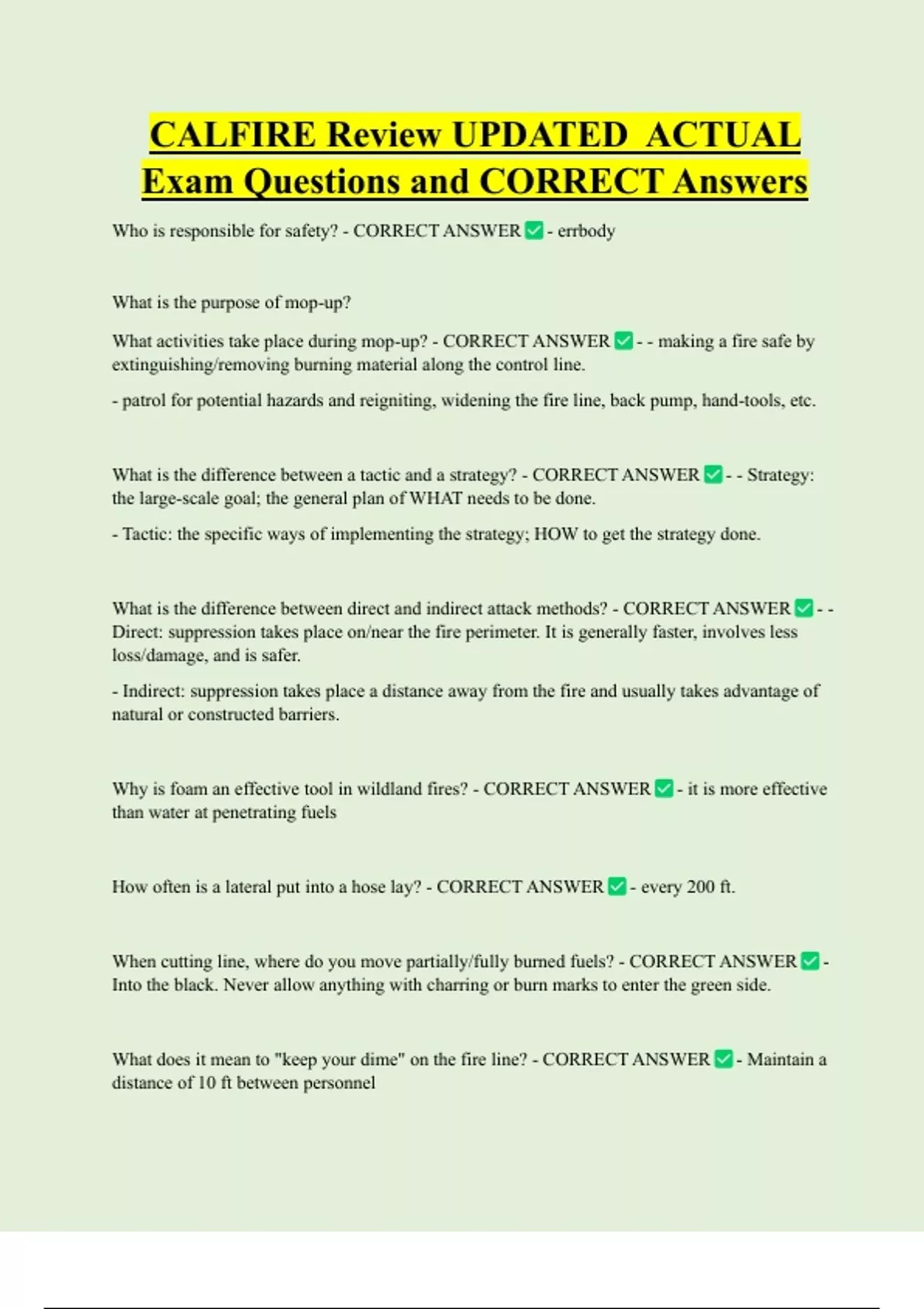 CALFIRE Review UPDATED ACTUAL Exam Questions and CORRECT Answers Who is responsible for safety? - CORRECT ANSWER - errbody What is the purpose of mop-up? What activities take place during mop-up? - CORRECT ANSWER - - making a fire safe by extinguishing/removing burning material along the control line. - patrol for potential hazards and reigniting, widening the fire line, back pump, hand-tools, etc.