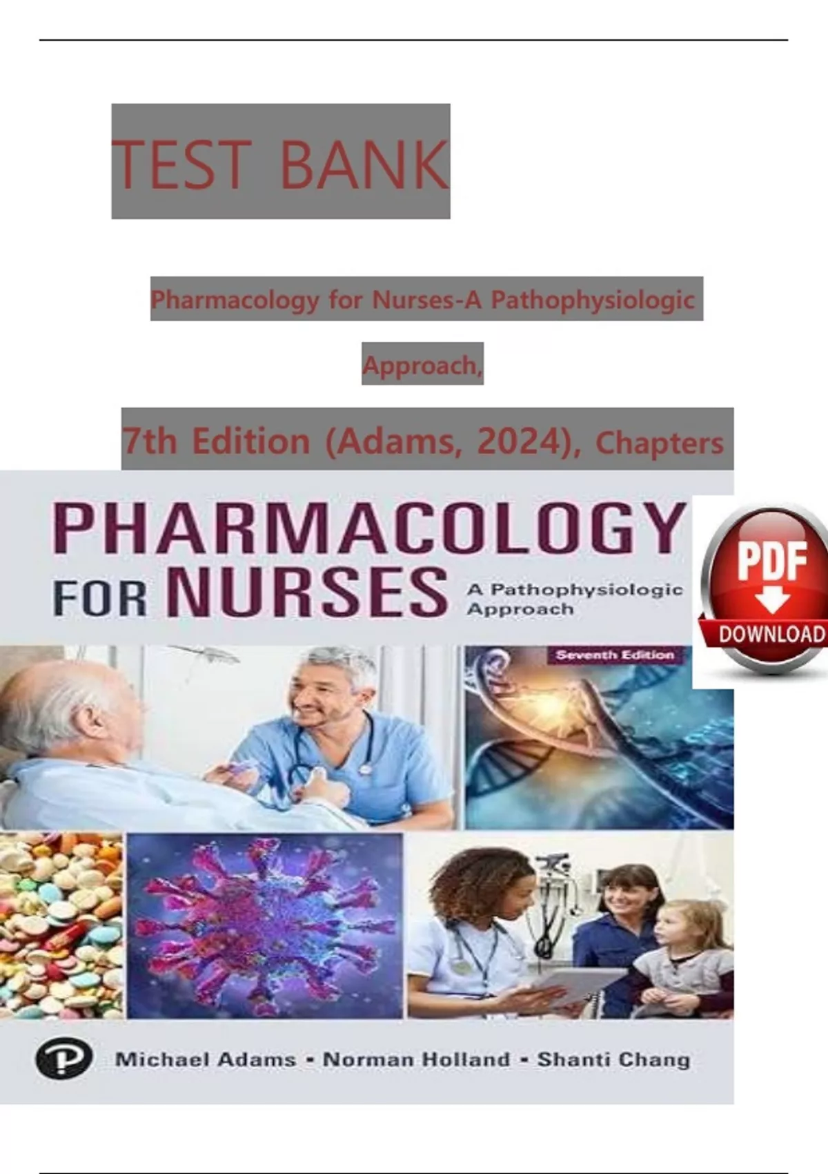 **Product Title:** Pharmacology for Nurses: A Pathophysiologic Approach, 7th Edition (Adams, 2025) - Test Bank (Chapters 1-50) **Product Description:** This comprehensive test bank is designed to accompany the 7th edition of "Pharmacology for Nurses: A Pathophysiologic Approach" by Adams, published in 2025. Covering chapters 1-50, this valuable resource provides nursing students and educators with a wealth of assessment questions and answers to reinforce their understanding of pharmacology concepts. The test bank includes a wide range of question types, including multiple-choice, true/false, and short-answer questions, ensuring that students are thoroughly prepared for exams and quizzes. Each question is carefully crafted to align with the learning objectives of the textbook, guaranteeing that students are assessed on their knowledge of key pharmacology principles, drug classes, and therapeutic applications. With this test bank, nursing educators can easily create customized quizzes, exams, and assignments that cater to their teaching style and course requirements. The accompanying answers and rationales provide valuable feedback for students, enabling them to identify areas for improvement and develop a deeper understanding of pharmacology concepts. **Key Features:** * Comprehensive coverage of chapters 1-50 of the 7th edition