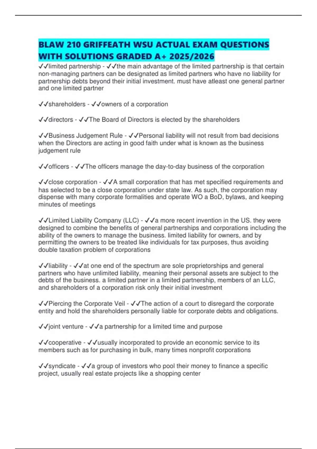 BLAW 210 GRIFFEATH WSU ACTUAL EXAM QUESTIONS WITH SOLUTIONS GRADED A+ 2025/2026