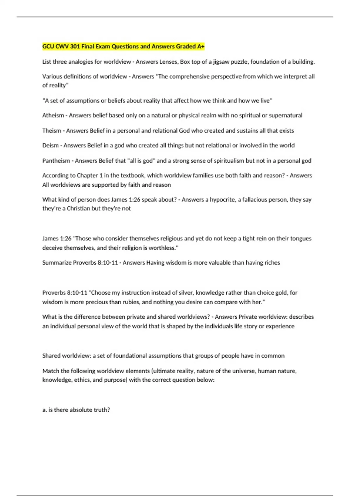 GCU CWV 301 Final Exam Questions and Answers Graded A+ List three analogies for worldview - Answers Lenses, Box top of a jigsaw puzzle, foundation of a building. Various definitions of worldview - Answers "The comprehensive perspective from which we interpret all of reality" "A set of assumptions or beliefs about reality that affect how we think and how we live" Atheism - Answers belief based only on a natural or physical realm with no spiritual or supernatural Theism - Answers Belief in a personal and relational God who created and sustains all that exists Deism - Answers Belief in a god who created all things but not relational or involved in the world Pantheism - Answers Belief that "all is god" and a strong sense of spiritualism but not in a personal god According to Chapter 1 in the textbook, which worldview families use both faith and reason? - Answers All worldviews are supported by faith and reason What kind of person does James 1:26 speak about? - Answers a hypocrite, a fallacious person, they say they're a Christian but they're not James 1:26 "Those who consider themselves religious and yet do not keep a tight rein on their tongues deceive themselves, and their religion is worthless." Summarize Proverbs 8:10-11 - Answers Having wisdom is more valuable than having riches Proverbs 8:10-11 "Choose my instruction instead of silver, knowledge rather than choice gold, for wisdom is more precious than rubies, and nothing you desire can compare with her." What is the difference between private and shared worldviews? - Answers Private worldview: describes an individual personal view of the world that is shaped by the individuals life story or experience Shared worldview: a set of foundational assumptions that groups of people have in common Match the following worldview elements (ultimate reality, nature of the universe, human nature, knowledge, ethics, and purpose) with the correct question below: a. is there absolute truth? b. Is there a God? c. How do we know right from wrong? d. Is there a spiritual part of the universe? e. Does life have meaning? f. Are humans merely higher orders of mammals? - Answers a. Knowledge: is there absolute truth? b. Ultimate reality: is there a God? c. Ethics: how do we know right from wrong? d. Nature of the universe: is there a spiritual part to the universe? e. Purpose: does like have meaning?