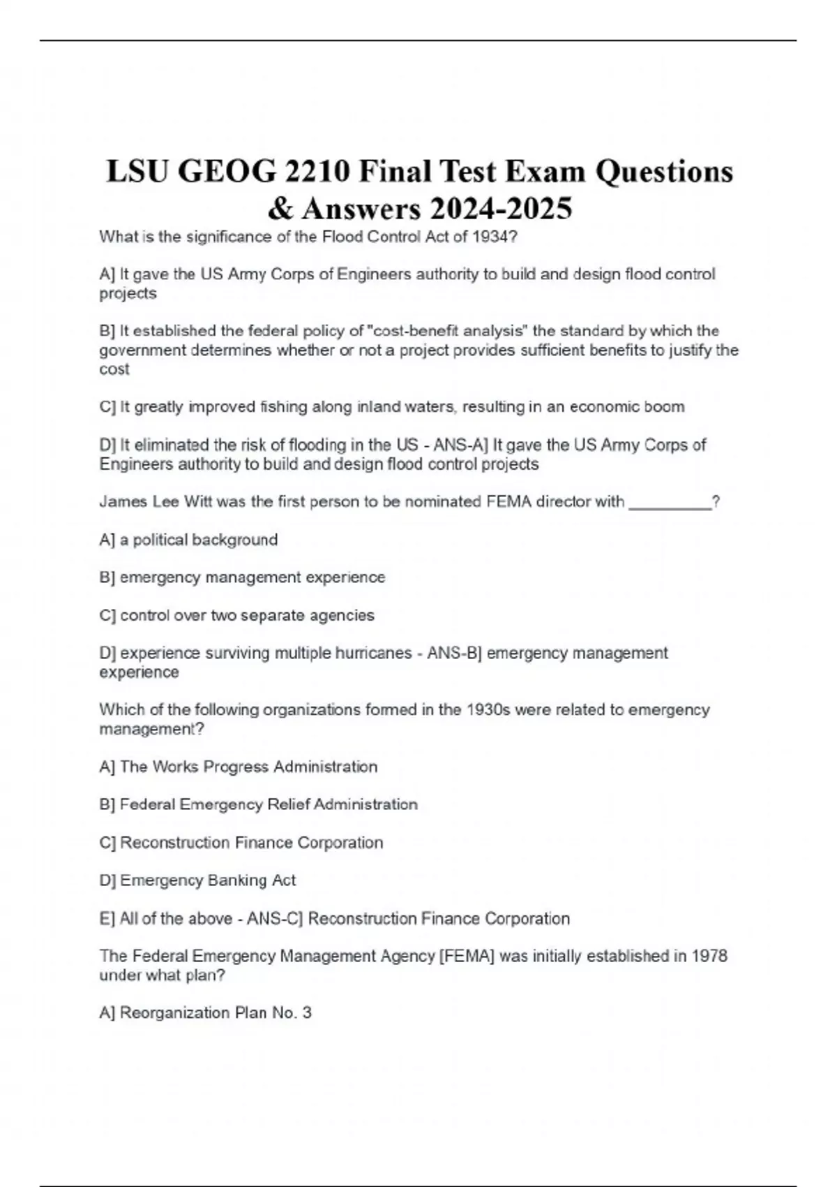 LSU GEOG 2210 Final Test Exam Questions & Answers What is the significance of the Flood Control Act of 1934? A] It gave the US Army Corps of Engineers authority to build and design flood control projects B] It established the federal policy of "cost-benefit analysis" the standard by which the government determines whether or not a project provides sufficient benefits to justify the cost C] It greatly improved fishing along inland waters, resulting in an economic boom D] It eliminated the risk of flooding in the US - ANS-A] It gave the US Army Corps of Engineers authority to build and design flood control projects James Lee Witt was the first person to be nominated FEMA director with _________? A] a political background B] emergency management experience C] control over two separate agencies D] experience surviving multiple hurricanes - ANS-B] emergency management experience Which of the following organizations formed in the 1930s were related to emergency management? A] The Works Progress Administration B] Federal Emergency Relief Administration C] Reconstruction Finance Corporation D] Emergency Banking Act E] All of the above - ANS-C] Reconstruction Finance Corporation The Federal Emergency Management Agency [FEMA] was initially established in 1978 under what plan? A] Reorganization Plan No. 3 B] Reorganization Plan No. 4 C] Reorganization Plan No. 1 D] Reorganization Plan No. 2 - ANS-A] Reorganization Plan No. 3 How did the Cold War era contribute to the evolution of modern emergency management? A] Most communities established the position of civil defense director, the first recognized face of emergency management in the U.S. B] The principal disaster risk of the era was natural disasters, especially in the 1950s C] No significant progress in the area of emergency management occurred during the Cold War D] The Federal Civil Defense Administration [FCDA] was established, a well-staffed and well-funded agency charged with responding to disasters - ANS-A] Most communities established the position of civil defense director, the first recognized face of emergency management in the U.S. How did James Lee Witt change FEMA when he became director? A] He reformed the agency internally and externally, and initiated open communication with state and local partners B] He ordered the construction of additional flood protection structures across the country to reduce flooding C] He required all businesses nationwide to participate in disaster planning D] He directed that FEMA send food shipments to all homes in the US for use in case of emergency - ANS-A] He reformed the agency internally and externally, and initiated open communication with state and local partners What changes did the creation of the Department of Homeland Security bring about for the federal emergency management capacity? A] FEMA became part of the DHS and was no longer a cabinet level office B] An increase in funding for natural hazard planning C] Capabilities for mitigation, preparedness, response, and recovery were more consolidated in to one part of DHS D] Federal emergency management and disaster assistance capabilities were once again scattered across numerous federal departments E] Both A and D F] Both B and C - ANS-F] Both B and C Who's administration was the first to invest federal funds for emergency management functions? A] Theodore Roosevelt B] Franklin Roosevelt C] George W. Bush D] Richard Nixon - ANS-B] Franklin Roosevelt What is emergency management? A] The study of disasters and where they occur B] A discipline that deals with risk and risk avoidance C] Working with the Red Cross to feed survivors of a disaster D] The science of constructing communities that are resistant to physical and environmental threats - ANS-B] A discipline that deals with risk and risk avoidance What disaster led to the creation of the National Flood Insurance Program? A] Hurricane Betsy B] The "Ash Wednesday" storm along the East Coast in 1962 C] Hurricane Katrina D] Hurricane Camille - ANS-A] Hurricane Betsy -Land-use planning: -structural controls: -Design and constructionist applications: -Financial incentives: -Hazard identification and mapping: - ANS--the use of building codes, architecture, and design criteria, and soils and landscaping considerations to reduce risk -the use of a built structure to mitigate risk -the use of strategies such as land acquisition, easements, storm water management, annexation, environmental review, and floodplain management plans to reduce risk -the use of special tax assessments, passing tax increase or bonds, offering relocation assistance, and targeting federal community development or renewal grant funds for mitigation -an analysis of what the hazards are in a particular area, and identification or areas that could be affected by these hazards What technological tool has aided the practice of mitigation for local planning organization? A] US Geological Survey B] Geographic Information Systems C] FEMA's HAZUS methodology D] International Building Code - ANS-B] Geographic Information Systems Why haven't risk-reduction and risk-management programs been more widely applied? A] Denial of the risk B] A focus on short-term rewards that does not reward programs that provide long-term benefits Continues...