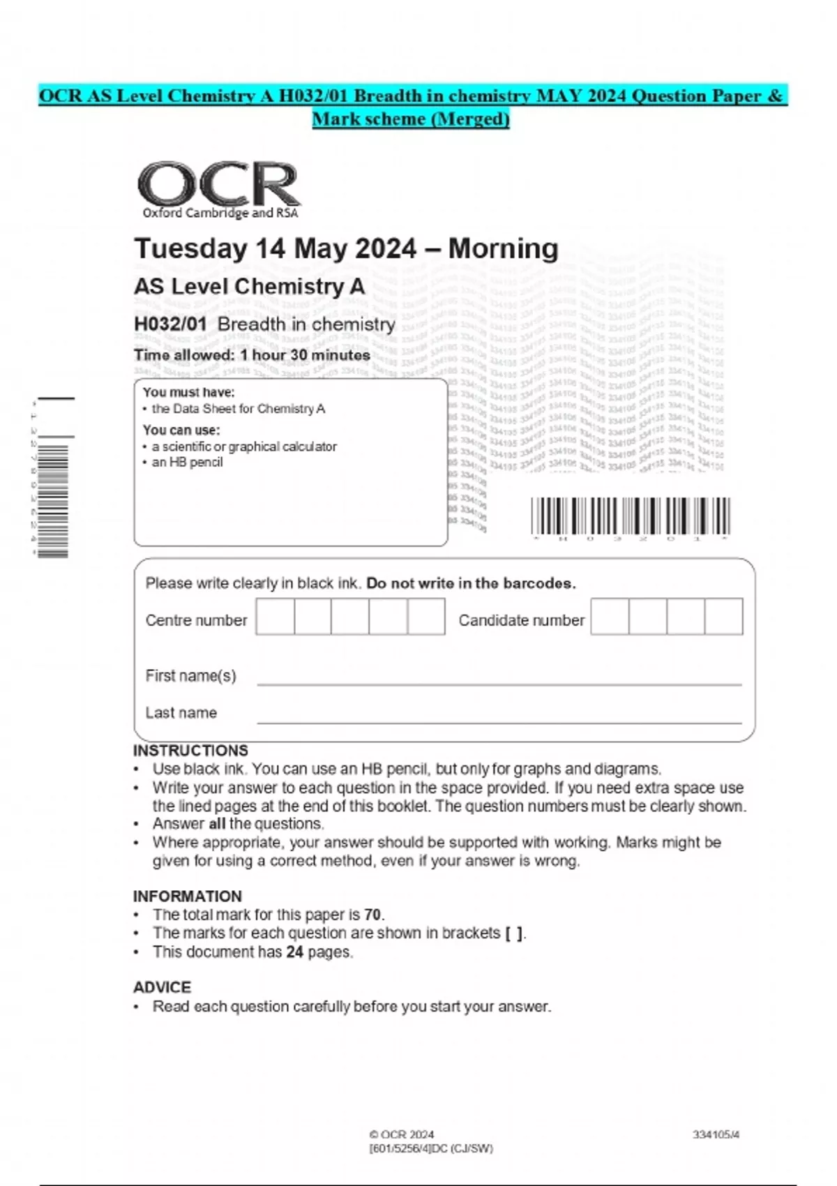 OCR AS Level Chemistry A H032/01 Breadth in chemistry MAY 2024 Question Paper & Mark scheme (Merged)