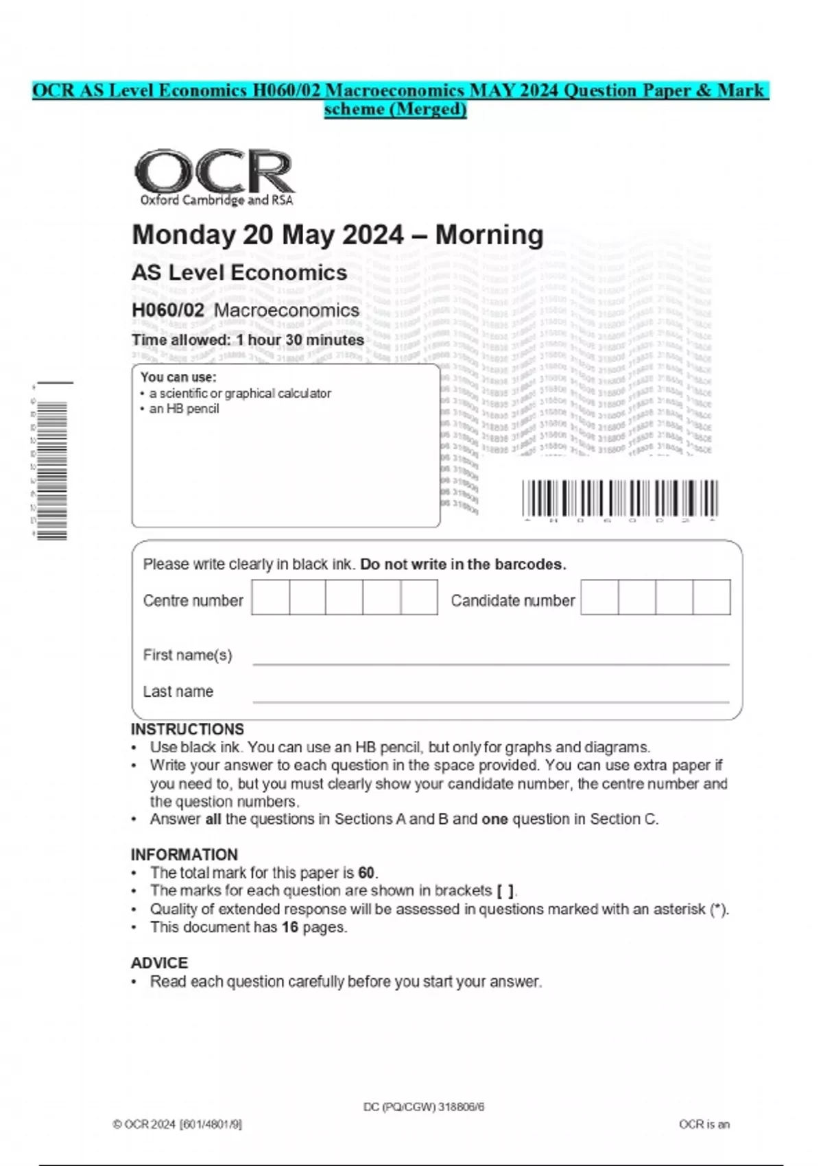 OCR AS Level Economics H060/02 Macroeconomics MAY 2024 Question Paper & Mark scheme (Merged)