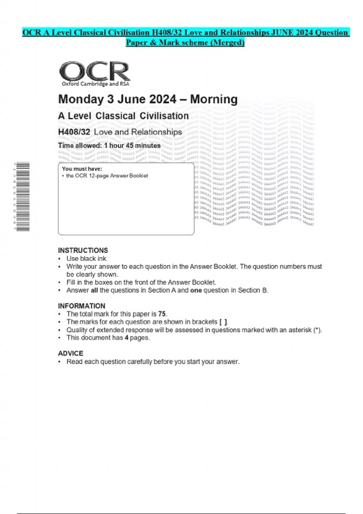 OCR A Level Classical Civilisation H408/32 Love and Relationships JUNE 2024 Question Paper & Mark scheme (Merged)