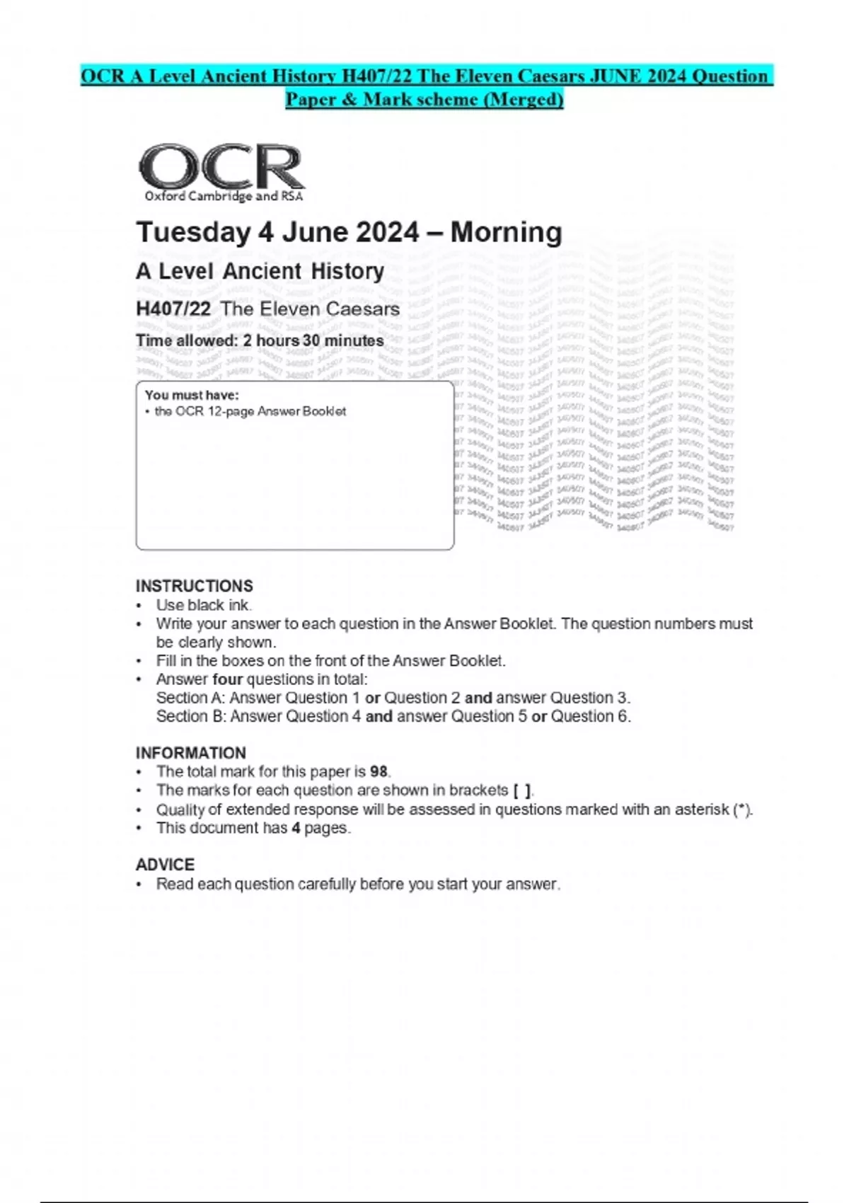 OCR A Level Ancient History H407/22 The Eleven Caesars JUNE 2024 Question Paper & Mark scheme (Merged