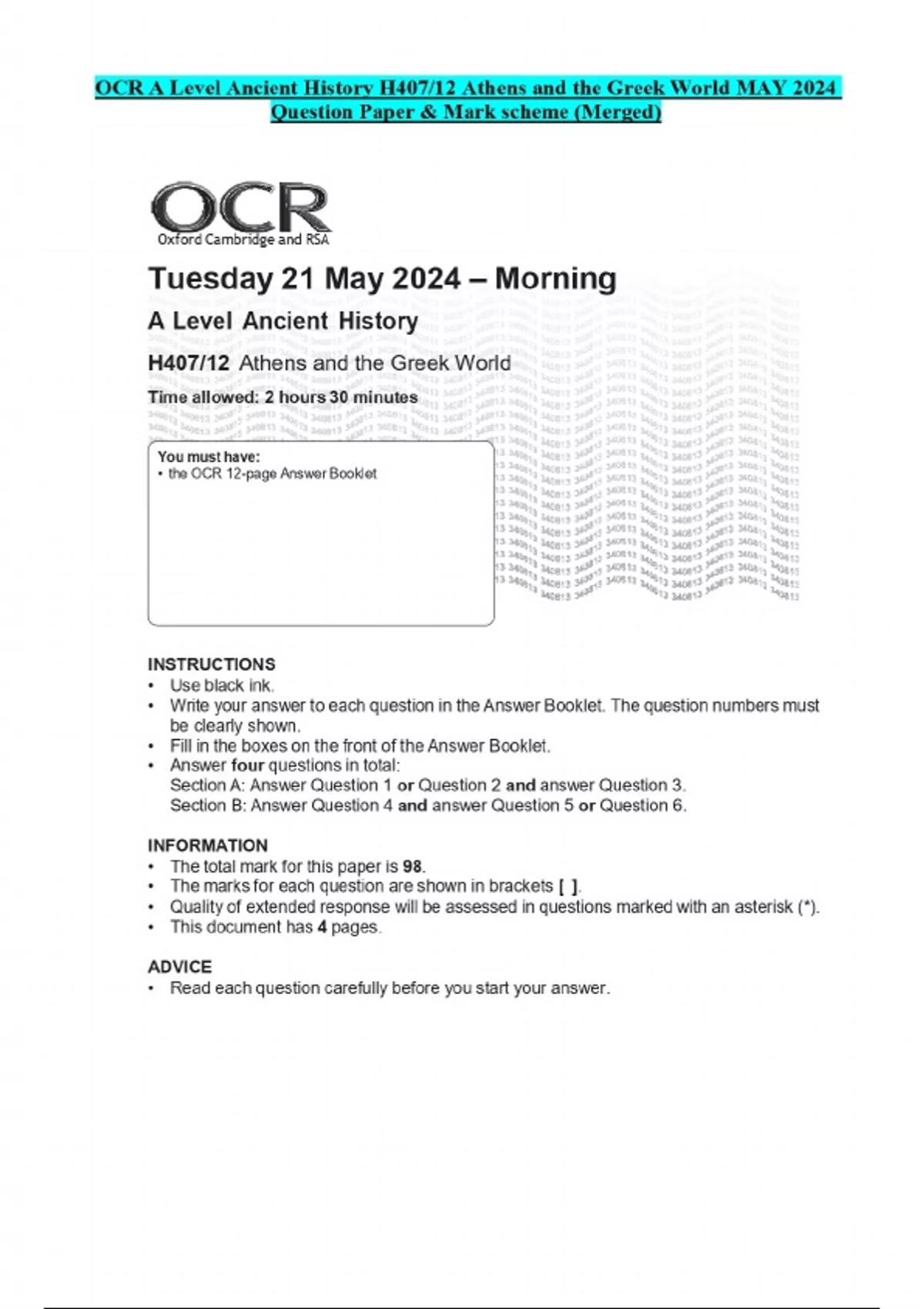 OCR A Level Ancient History H407/12 Athens and the Greek World MAY 2024 Question Paper & Mark scheme (Merged)