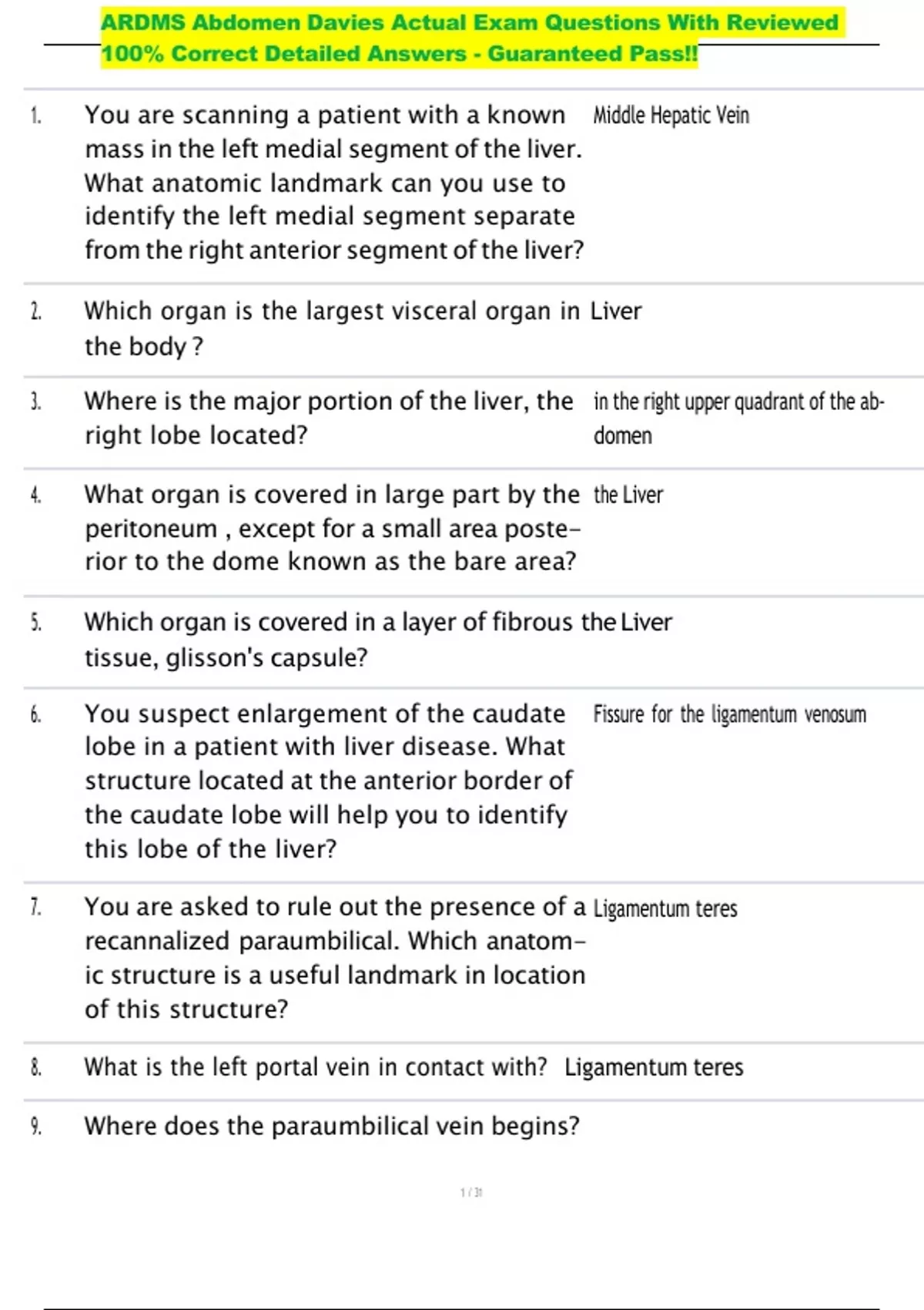 , ARDMS Abdomen Davies Actual Exam Questions With Reviewed