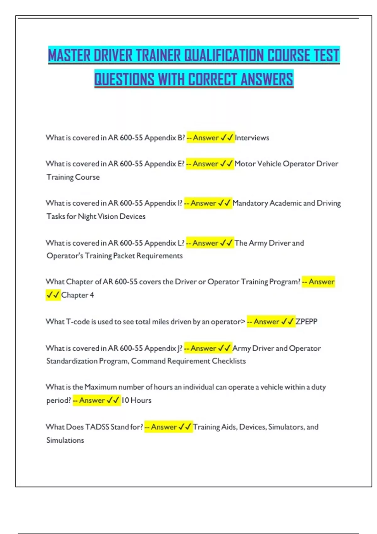 MASTER DRIVER TRAINER QUALIFICATION COURSE TEST QUESTIONS WITH CORRECT ANSWERS