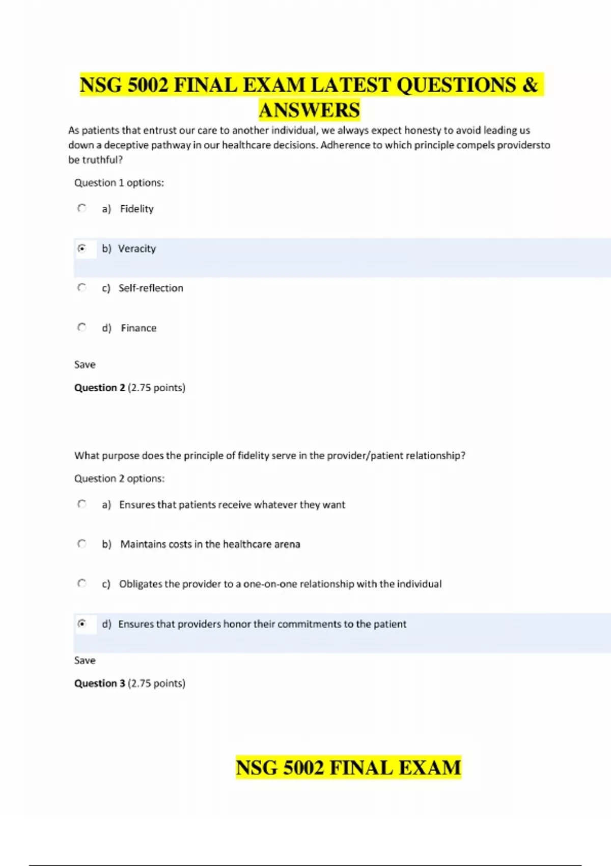 NSG 5002 Final Exam – Advanced Theoretical Perspectives for Nursing-Questions and Answers/NSG 5002 Final Exam – Advanced Theoretical Perspectives for Nursing-Questions and Answers. As patients that entrust our care to another individual, we always expect honesty to avoid leading us down a deceptive pathway in our healthcare decisions. Adherence to which principle compels providers to be truthful What purpose does the principle of fidelity serve in the provider/patient relationship? We all know that collaboration is integral to becoming a successful nurse practitioner. Among collaborations, however, only one can be considered as the most important. While each example below is important, which is the most important collaboration? The one that occurs: Chronic, non-communicable diseases account for disproportionate costs to the healthcare system. According to the World Health Organization, what percent of preventable deaths and disabilities occur in the Americas related to chronic non-communicable diseases? Improvements in the delivery and management of healthcare are necessary if we are to improve the overall health of this nation’s population. Which of the following are identified in your readings as strategic in the movement to improve the healthcare system? Encouragement of patients to take effective actions in their own healthcare refers to the concept of: Population disease management is a term used to describe: Changes in Medicare are a method the government uses to make changes to reimbursement schedules for healthcare. Currently, Medicare reimburses nurse practitioners for all services, even those deemed to be exclusive to nursing? Medicare covers inpatient hospital services under which part of the Medicare insurance? Medicare hospital insurance (Part A) is funded through what system? Medicaid is mandated to be provided by each state through federal codes. Each state must offer Medicaid exactly as the federal government prescribes. Eligibility for Medicaid includes the following: Narrowed coronary arteries or plague rupture within the arteries of the coronary system may directly cause which condition? What happens to coronary flow related to CAD? In CAD, after both systolic and diastolic dysfunction have occurred, the typical pattern of chest pain and related EKG changes occur. During an EKG, you should expect to see ST-segment and T-wave changes that are central to demonstration of ischemia occurring relatively late in the ischemic cascade. What is considered the first-line initial approach to test for CAD? What are two of the most common forms of Exercise Stress Tests used today? Maintenance of an Isometric ST-segment during exercise is the response of? By standard criteria, how is a positive stress test defined? Your patient underwent an exercise stress test for CAD. There is significant elevation of the ST-segYour patient underwent an exercise stress test for CAD. There is significant elevation of the ST-segment. What do you need to know about these changes to manage your patient’s care?Your patient underwent an exercise stress test for CAD. There is significant elevation of the ST-segment. What do you need to know about these changes to manage your patient’s care?ment. What do you need to know about these changes to manage your patient’s care? After completion of the exercise stress test, you would measure the ST-segment depression after the J point of the QRS. The J point is located where in relation to the QRS? What ECG changes can reduce the specificity of the ETT? Why would inability to exercise reduce the specificity of the routine ETT? The sensitivity of a routine ETT is effort dependent. What physiological changes occur during effort in the routine ETT? Specifically, when is an ETT considered to be negative? Your mentor says that you should be prepared to know how to determine the maximum heart rate for your patient during the ETT. How is the age-predicted maximum heart rate during an ETT determined? Your patient has a maximum age-predicted heart rate of 180. During the exercise, he reaches a heart rate of 140 and then states he can no longer exercise. You see no evidence of ischemia on the ECG. This would be diagnostic for what condition? Your patient has a maximum age-predicted heart rate of 180. During the exercise he reaches a heart rate of 140 and then states he can no longer exercise. You see evidence of ischemic changes on the ECG. This would be predictive of what condition? Ischemic changes on ECG during ETT is highly predictive of CAD. What is another important strong predictor of CAD that you might see during an ETT? The leads on the ECG showing ischemic changes during or immediately after an ETT can correlate roughly to the culprit artery or arteries with significant CAD. Your practice partner just ordered an exercise echocardiography 2DE for a patient with suspected cardiovascular risk. This patient has known resting wall motion abnormalities. Why would this not be the best test to assess this patient’s cardiac risk? You are considering adding an adjunctive form of testing to detect wall motion abnormalities during the ETT. You-select Echocardiography as the added testing. You choose this test because you know that echocardiography does what when added to a standard ETT? On the echocardiography during the ETT you notice the following change: abnormal left ventricular ejection fraction. What do these changes suggest related to this patient? Your patient cannot sit on a bicycle and has difficulties walking a treadmill with limited capacity for exercising. Still, you know that the ETT is the preferred test for CAD. You consider adding a pharmacological agent to get to maximum heart rate. What agent would be the most commonly used agent to assist in an ETT? Your patient is morbidly obese and cannot sit on a bicycle or walk a treadmill. She also has marked and severe emphysema. You need to make an assessment of the risk of significant CAD and your pa