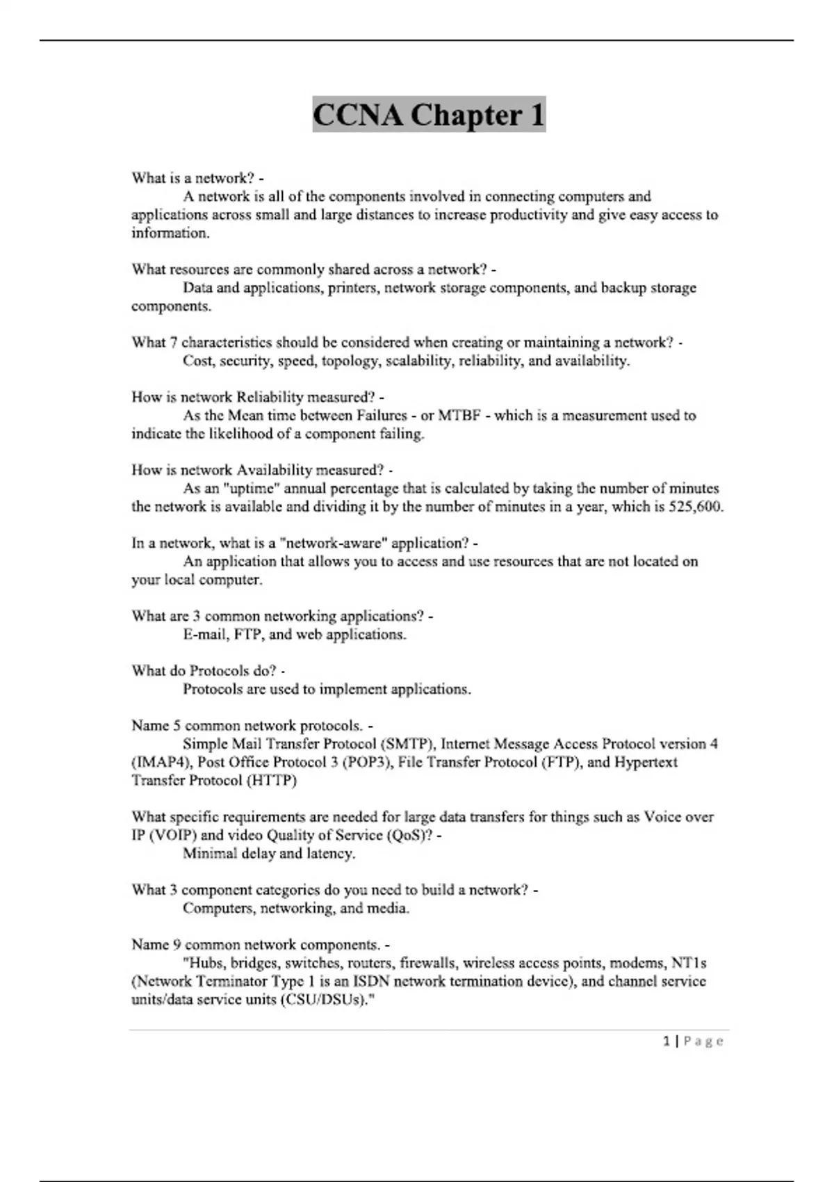 CCNA Chapter 1 What is a network? - A network is all of the components involved in connecting computers and applications across small and large distances to increase productivity and give easy access to information. What resources are commonly shared across a network? - Data and applications, printers, network storage components, and backup storage components. What 7 characteristics should be considered when creating or maintaining a network? - Cost, security, speed, topology, scalability, reliability, and availability. How is network Reliability measured? - As the Mean time between Failures - or MTBF - which is a measurement used to indicate the likelihood of a component failing. How is network Availability measured? - As an "uptime" annual percentage that is calculated by taking the number of minutes the network is available and dividing it by the number of minutes in a year, which is 525,600. In a network, what is a "network-aware" application? - An application that allows you to access and use resources that are not located on your local computer. What are 3 common networking applications? - E-mail, FTP, and web applications. What do Protocols do? - Protocols are used to implement applications. Name 5 common network protocols. - Simple Mail Transfer Protocol (SMTP), Internet Message Access Protocol version 4 (IMAP4), Post Office Protocol 3 (POP3), File Transfer Protocol (FTP), and Hypertext Transfer Protocol (HTTP) What specific requirements are needed for large data transfers for things such as Voice over IP (VOIP) and video Quality of Service (QoS)? - Minimal delay and latency. What 3 component categories do you need to build a network? - Computers, networking, and media. Name 9 common network components. - "Hubs, bridges, switches, routers, firewalls, wireless access points, modems, NT1s (Network Terminator Type 1 is an ISDN network termination device), and channel service units/data service units (CSU/DSUs)."
