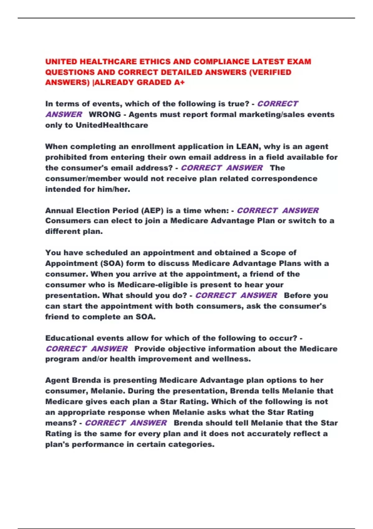 UNITED HEALTHCARE ETHICS AND COMPLIANCE LATEST EXAM QUESTIONS AND CORRECT DETAILED ANSWERS (VERIFIED ANSWERS) |ALREADY GRADED A+ In terms of events, which of the following is true? - CORRECT ANSWER WRONG - Agents must report formal marketing/sales events only to UnitedHealthcare When completing an enrollment application in LEAN, why is an agent prohibited from entering their own email address in a field available for the consumer's email address? - CORRECT ANSWER The consumer/member would not receive plan related correspondence intended for him/her. Annual Election Period (AEP) is a time when: - CORRECT ANSWER Consumers can elect to join a Medicare Advantage Plan or switch to a different plan. You have scheduled an appointment and obtained a Scope of Appointment (SOA) form to discuss Medicare Advantage Plans with a consumer. When you arrive at the appointment, a friend of the consumer who is Medicare-eligible is present to hear your presentation. What should you do? - CORRECT ANSWER Before you can start the appointment with both consumers, ask the consumer's friend to complete an SOA. Educational events allow for which of the following to occur? - CORRECT ANSWER Provide objective information about the Medicare program and/or health improvement and wellness. Agent Brenda is presenting Medicare Advantage plan options to her consumer, Melanie. During the presentation, Brenda tells Melanie that Medicare gives each plan a Star Rating. Which of the following is not an appropriate response when Melanie asks what the Star Rating means? - CORRECT ANSWER Brenda should tell Melanie that the Star Rating is the same for every plan and it does not accurately reflect a plan's performance in certain categories. When does Permission to Contact for Medicare Advantage and/or Prescription Drug Plans expire? - CORRECT ANSWER Once contact is made or 9 months from the date the consumer provided permission (e.g. consumer signature date on BRC) or 90 days if on federal do not call list, whichever comes first. Julie, a consumer, is having difficulty understanding the information her agent, Victor, is presenting at her in-home appointment. She provides Victor with her cousin's telephone number and email address and asks him to explain the plan to her cousin, who frequently assists with her health care decisions. The next day, Victor emails Julie's cousin. Has Victor been compliant? - CORRECT ANSWER No. Victor violated United Healthcare permission to contact guidelines by emailing the cousin without the cousin's permission. John has Power of Attorney to act on behalf of his mother. What does that mean when it comes to his mother enrolling in a Medicare Advantage Plan? - CORRECT ANSWER John may sign the Enrollment Application and must be able to provide documentation upon request by the Plan that indicates his authority under state law to enroll his mother. Which of the following is not considered unsolicited contact with a Medicare eligible consumer according to CMS regulations and UnitedHealthcare's rules, policies, and procedures? - CORRECT ANSWER Mailing a marketing brochure to the consumer via postal mail. To sign an enrollment application on behalf of a consumer, what authority must the individual have? - CORRECT ANSWER The individual must be legally authorized in the state in which the consumer resides to act on behalf of the consumer (e.g. Power of Attorney). As an agent, you must not do which of the following when marketing UnitedHealthcare Medicare Advantage plans to consumers? - CORRECT ANSWER Use providers or provider groups to distribute printed information comparing benefits of different health plans without approval. As an agent, you have an obligation to only enroll a consumer in a product: - CORRECT ANSWER That is suitable for the consumer's needs, goals, and financial resources. What is the purpose of the Statement of Understanding? - CORRECT ANSWER It ensures that when consumers sign the Medicare Advantage and/or Part D Enrollment Application, they are acknowledging their understanding that they are actually enrolling, in which plan they are enrolling, and standard disclosures. What is the definition of Fraud? - CORRECT ANSWER Fraud is intentionally misrepresenting or concealing facts to obtain something of value. Which of the items listed are examples of Fraud, Waste, and Abuse (FWA)? - CORRECT ANSWER - Submitting claims for services or supplies that were never provided - Consulting with a number of doctors in order to obtain multiple prescriptions for the same drug. - Billing for brand name drugs when generics were dispensed. Whose email address may the agent enter into the LEAN enrollment application? - CORRECT ANSWER Only the consumer's (or leave it blank). Which election period
