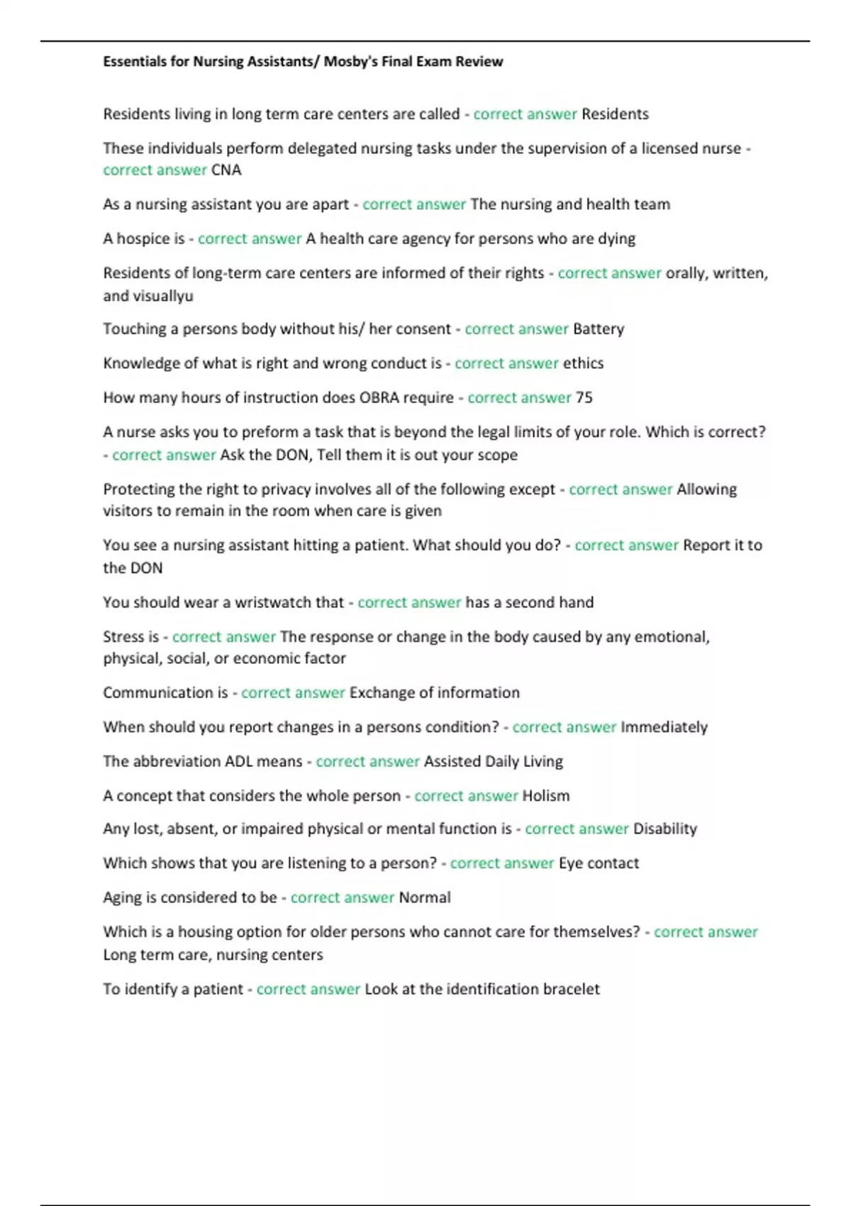 , Essentials for Nursing Assistants/ Mosby's Final Exam Review