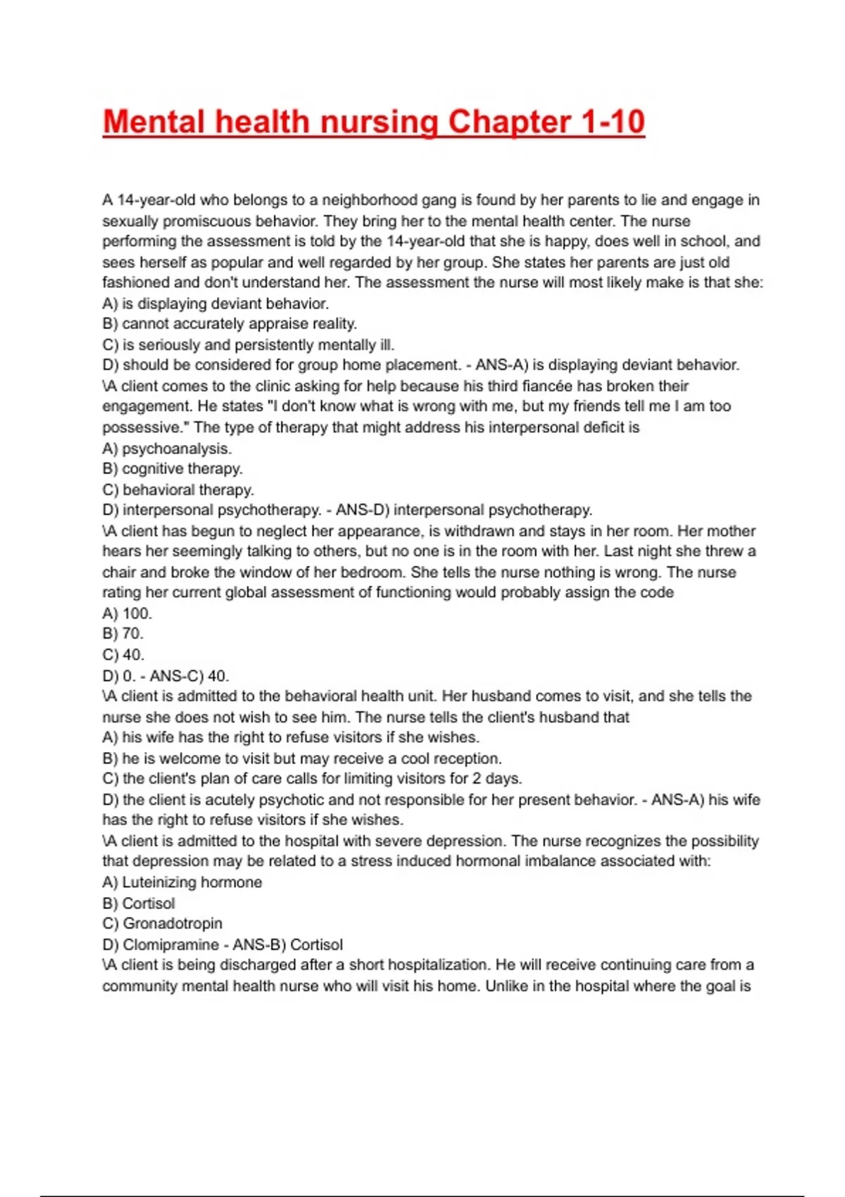 Mental health nursing Chapter 1-10 Exam 2025/2026 Questions With Completed & Verified Solutions.