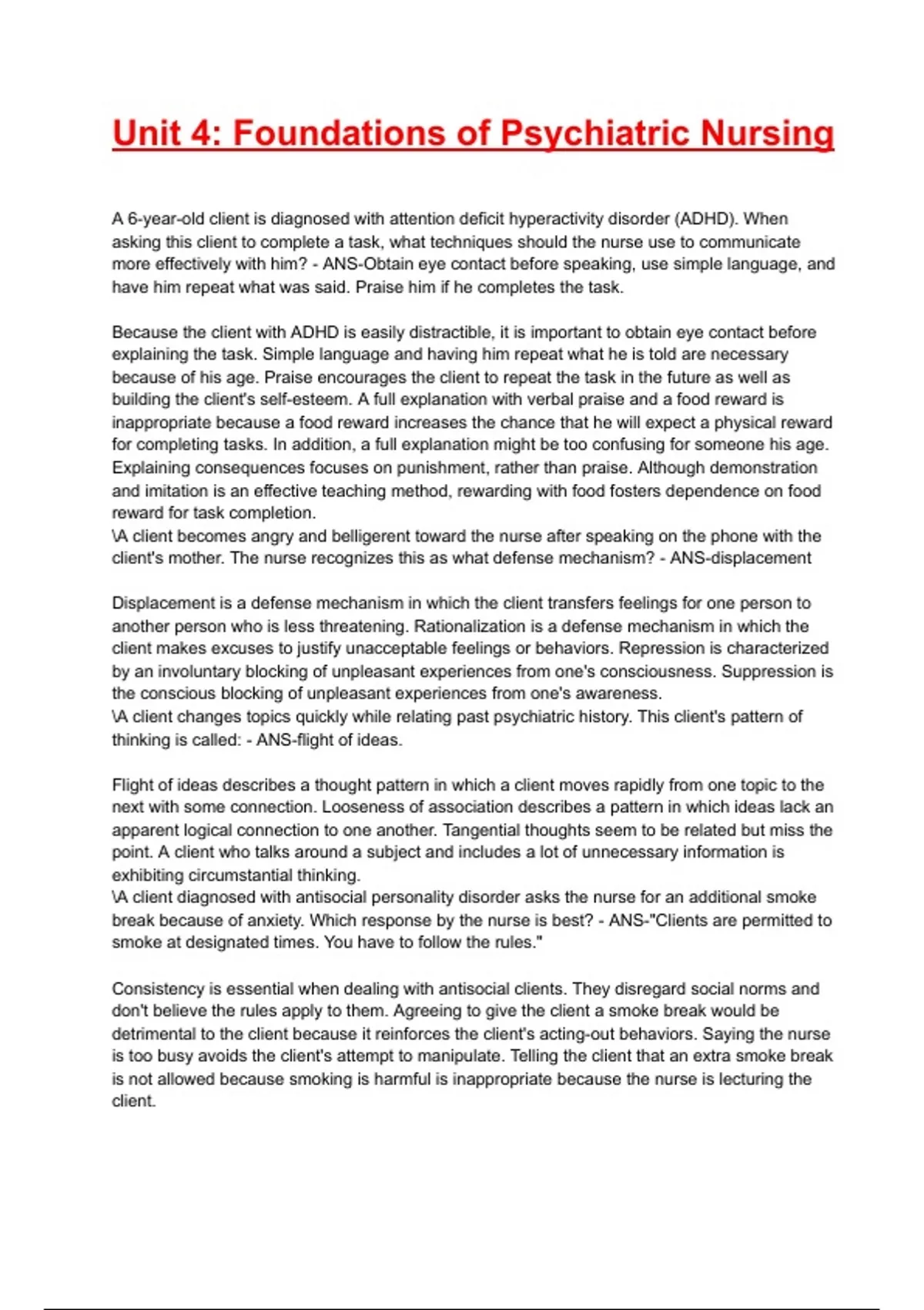 Unit 4: Foundations of Psychiatric Nursing Test Bank Exam 2025/2026 Questions With Verified Solutions