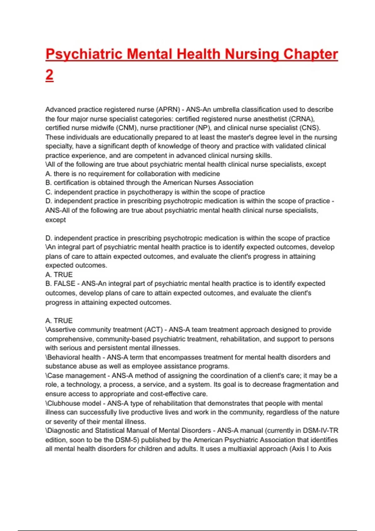 B. FALSE - ANS-An integral part of psychiatric mental health practice is to identify expected
