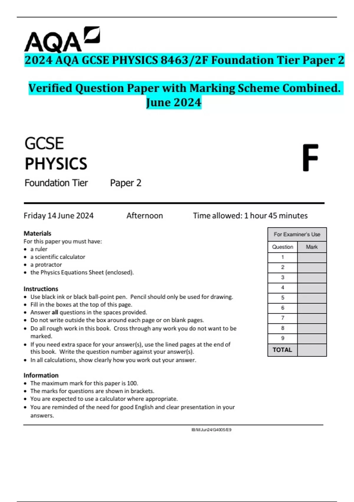 2024 AQA GCSE PHYSICS 8463/2F Foundation Tier Paper 2 Verified Question Paper with Marking Scheme Combined. June 2024