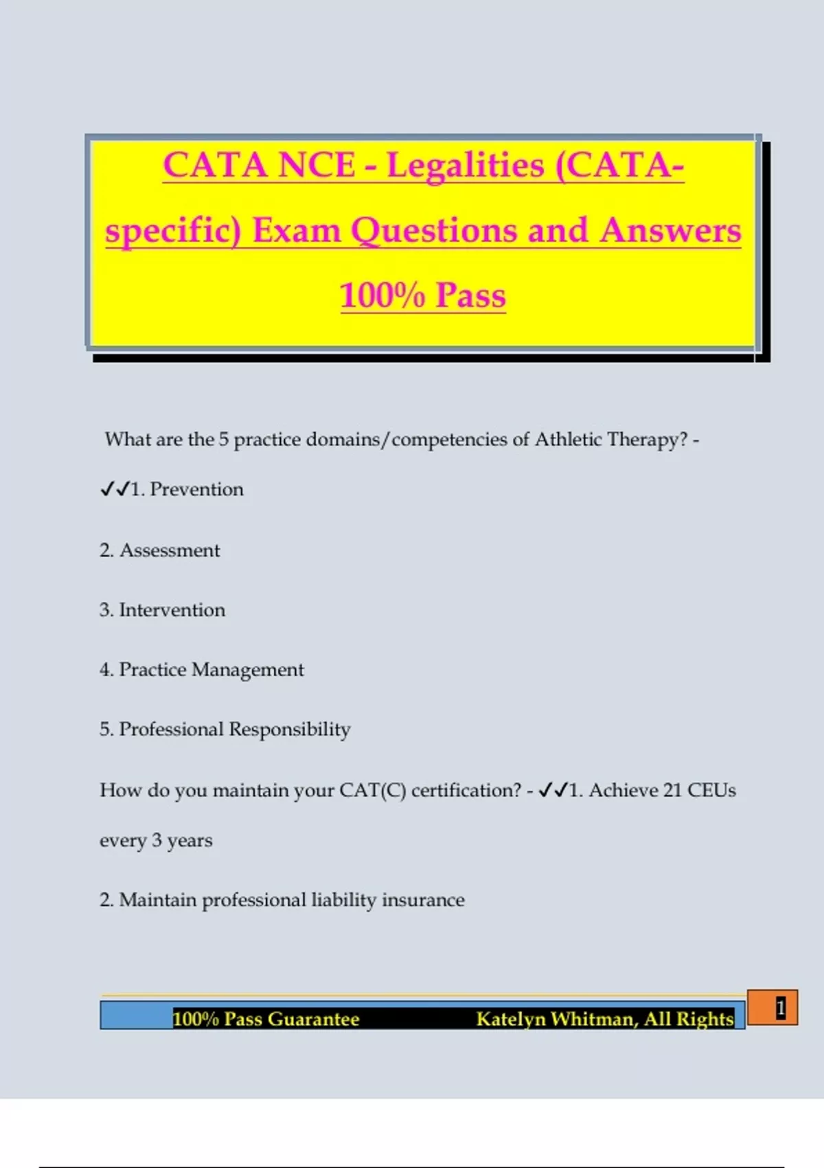 CATA NCE - Legalities (CATA- specific) Exam Questions and Answers 100% Pass What are the 5 practice domains/competencies of Athletic Therapy? - 1. Prevention 2. Assessment 3. Intervention 4. Practice Management 5. Professional Responsibility How do you maintain your CAT(C) certification? - 1. Achieve 21 CEUs every 3 years 2. Maintain professional liability insurance 2 100% Pass Guarantee Katelyn Whitman, All Rights 3. Maintain BLS certification 4. Pay annual dues for national + Provincial bodies How do you become a Certification Candidate? - 1. Be enrolled at a CATA accredited institution 2. Hold a valid First Aid and BLS certificate, or a CATA-approved equivalent 3. Complete the Online Application for Certification Candidate Membership 4. Maintain status for 18 months prior to attempting the NCE How does a Certification Candidate become a a CAT(C)? - 1. Successfully complete a CATA accredited program and earn a Bachelor's degree 2. Obtain a valid First Responder certificate or CATA equivalent in order to attempt the exam 3. Maintain BLS certificate or CATA approved eq