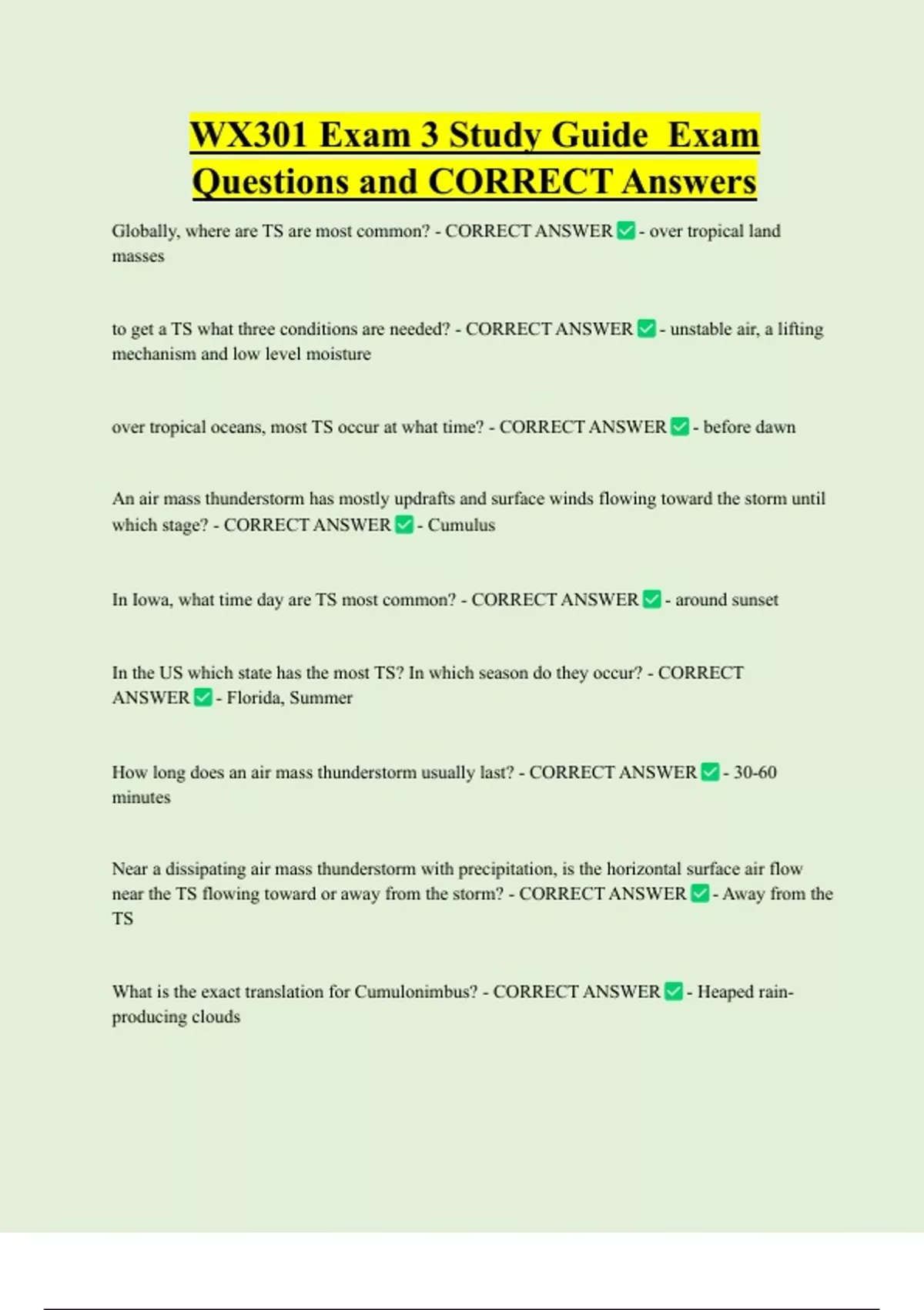 WX301 Exam 3 Study Guide Exam Questions and CORRECT Answers Globally, where are TS are most common? - CORRECT ANSWER - over tropical land masses to get a TS what three conditions are needed? - CORRECT ANSWER - unstable air, a lifting mechanism and low level moisture over tropical oceans, most TS occur at what time? - CORRECT ANSWER - before dawn
