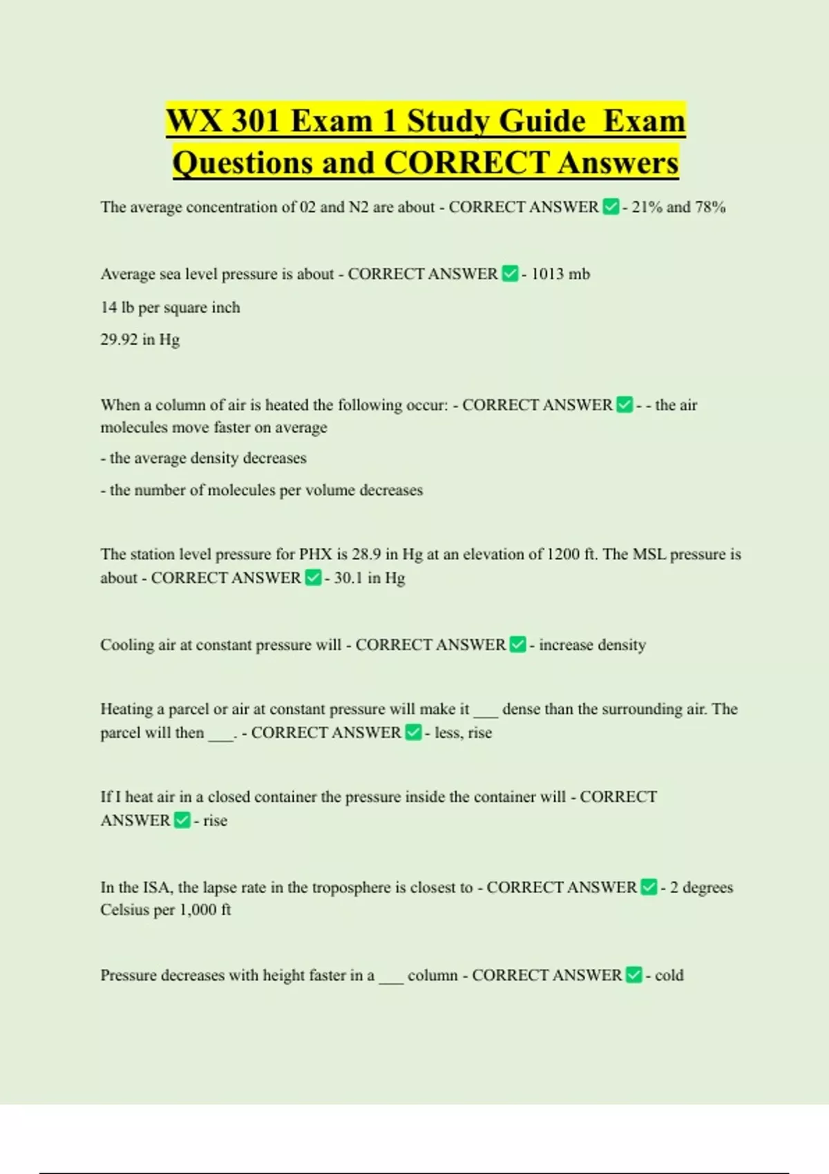 WX 301 Exam 1 Study Guide Exam Questions and CORRECT Answers The average concentration of 02 and N2 are about - CORRECT ANSWER - 21% and 78% Average sea level pressure is about - CORRECT ANSWER - 1013 mb 14 lb per square inch 29.92 in Hg When a column of air is heated the following occur: - CORRECT ANSWER - - the air molecules move faster on average - the average density decreases - the number of molecules per volume decrease
