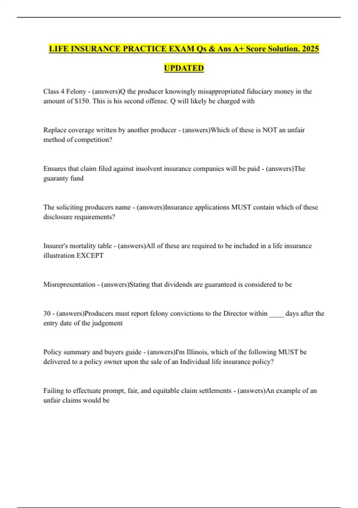 LIFE INSURANCE PRACTICE EXAM Qs & Ans A+ Score Solution. 2025