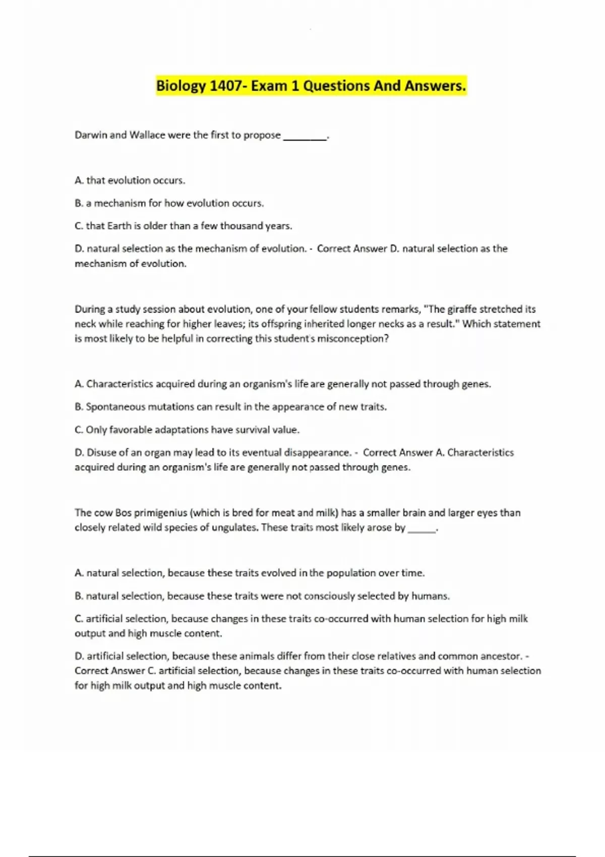 Biology 1407- Exam 1 Questions And Answers. Darwin and Wallace were the first to propose ________. A. that evolution occurs. B. a mechanism for how evolution occurs. C. that Earth is older than a few thousand years. D. natural selection as the mechanism of evolution. - Correct Answer D. natural selection as the mechanism of evolution. During a study session about evolution, one of your fellow students remarks, "The giraffe stretched its neck while reaching for higher leaves; its offspring inherited longer necks as a result." Which statement is most likely to be helpful in correcting this student's misconception? A. Characteristics acquired during an organism's life are generally not passed through genes. B. Spontaneous mutations can result in the appearance of new traits. C. Only favorable adaptations have survival value. D. Disuse of an organ may lead to its eventual disappearance. - Correct Answer A. Characteristics acquired during an organism's life are generally not passed through genes. The cow Bos primigenius (which is bred for meat and milk) has a smaller brain and larger eyes than closely related wild species of ungulates. These traits most likely arose by _____. A. natural selection, because these traits evolved in the population over time. B. natural selection, because these traits were not consciously selected by humans. C. artificial selection, because changes in these traits co-occurred with human selection for high milk output and high muscle content. D. artificial selection, because these animals differ from their close relatives and common ancestor. - Correct Answer C. artificial selection, because changes in these traits co-occurred with human selection for high milk output and high muscle content. Parasitic species tend to have simple morphologies. Which of the following statements best explains this observation? A. Parasites are lower organisms, and this is why they have simple morphologies. B. Parasites do not live long enough to inherit acquired characteristics. C. Simple morphologies convey some advantage in most parasites. D. Parasites have not yet had time to progress, because they are young evolutionarily. - Correct Answer C. Simple morphologies convey some advantage in most parasites. Starting from the wild mustard Brassica oleracea, breeders have created the strains known as Brussels sprouts, broccoli, kale, and cabbage. Therefore, which of the following statements is corre
