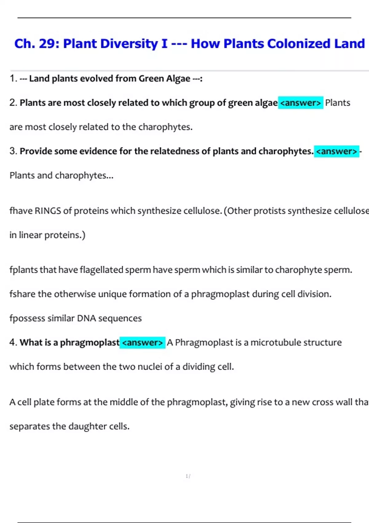 Ch. 29: Plant Diversity I --- How Plants Colonized Land 2.Plants are most closely related to which group of green algae <answer> Plants are most closely related to the charophytes. 3.Provide some evidence for the relatedness of plants and charophytes. <answer> - Plants and charophytes... fhave RINGS of proteins which synthesize cellulose. (Other protists synthesize cellulose in linear proteins.) fplants that have flagellated sperm have sperm which is similar to charophyte sperm. fshare the otherwise unique formation of a phragmoplast during cell division. fpossess similar DNA sequences