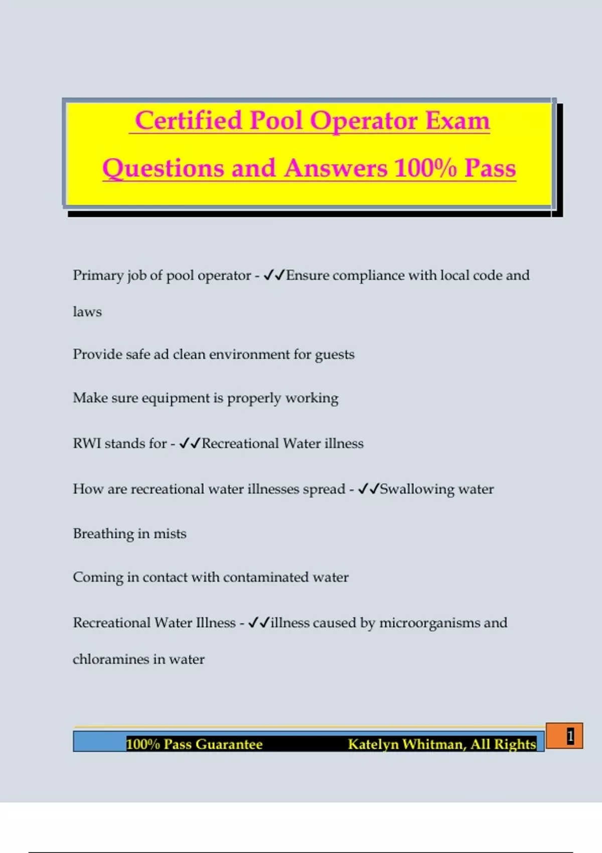 Certified Pool Operator Exam Questions and Answers 100% Pass Primary job of pool operator - Ensure compliance with local code and laws Provide safe ad clean environment for guests Make sure equipment is properly working RWI stands for - Recreational Water illness How are recreational water illnesses spread - Swallowing water Breathing in mists Coming in contact with contaminated water Recreational Water Illness - illness caused by microorganisms and chloramines in water 2 100% Pass Guarantee Katelyn Whitman, All Rights common illness caused by chloramines - Breathing disorder called swimmers asthma examples of microorganisms that can make you sick in pools - Pseudomonas aeruginosa E.coli Staph Crypto interior walls of pool - pool plaster or white coat what do pool pumps do? - They poll water form the pool main drains and skimmers pool main drain - point of strongest suction in the pool Reasons to close pool immediately - Main drain cover is broken or missing Main drain is not visible due to cloudy water pool telephone not working 3 100% Pass Guarantee Katelyn Whitman, All Rights Skimmers - water from surface passes through skimmers and debris get trapped in skimmer basket Skimmer Weir - prevents floating debris from reentering the pool where does water go after going through the pump? - filter where does water go after the filter? - heater where does water go after heater? - flow meter where does water go after going through flow meter? - back to the pool through the return lines Flow of pool water steps - drains and skimmers/skimmer basket and strainer basket