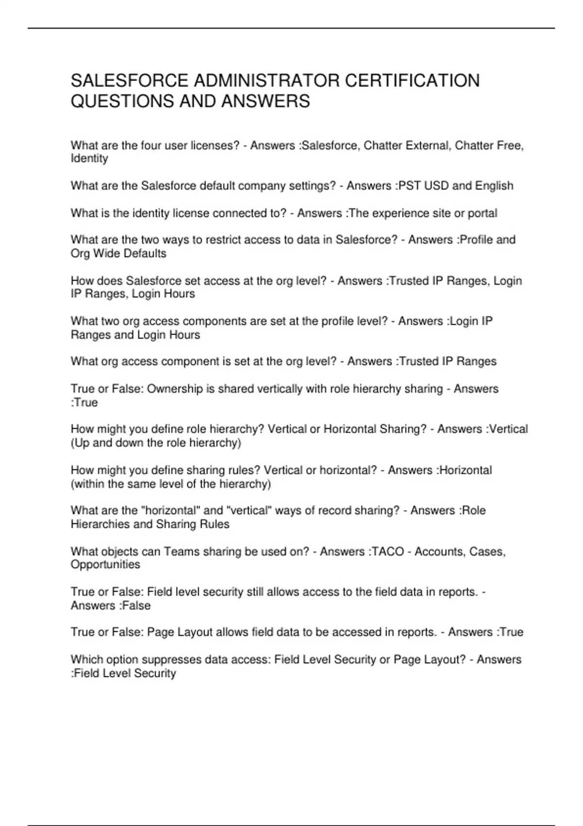 SALESFORCE ADMINISTRATOR CERTIFICATION QUESTIONS AND ANSWERS