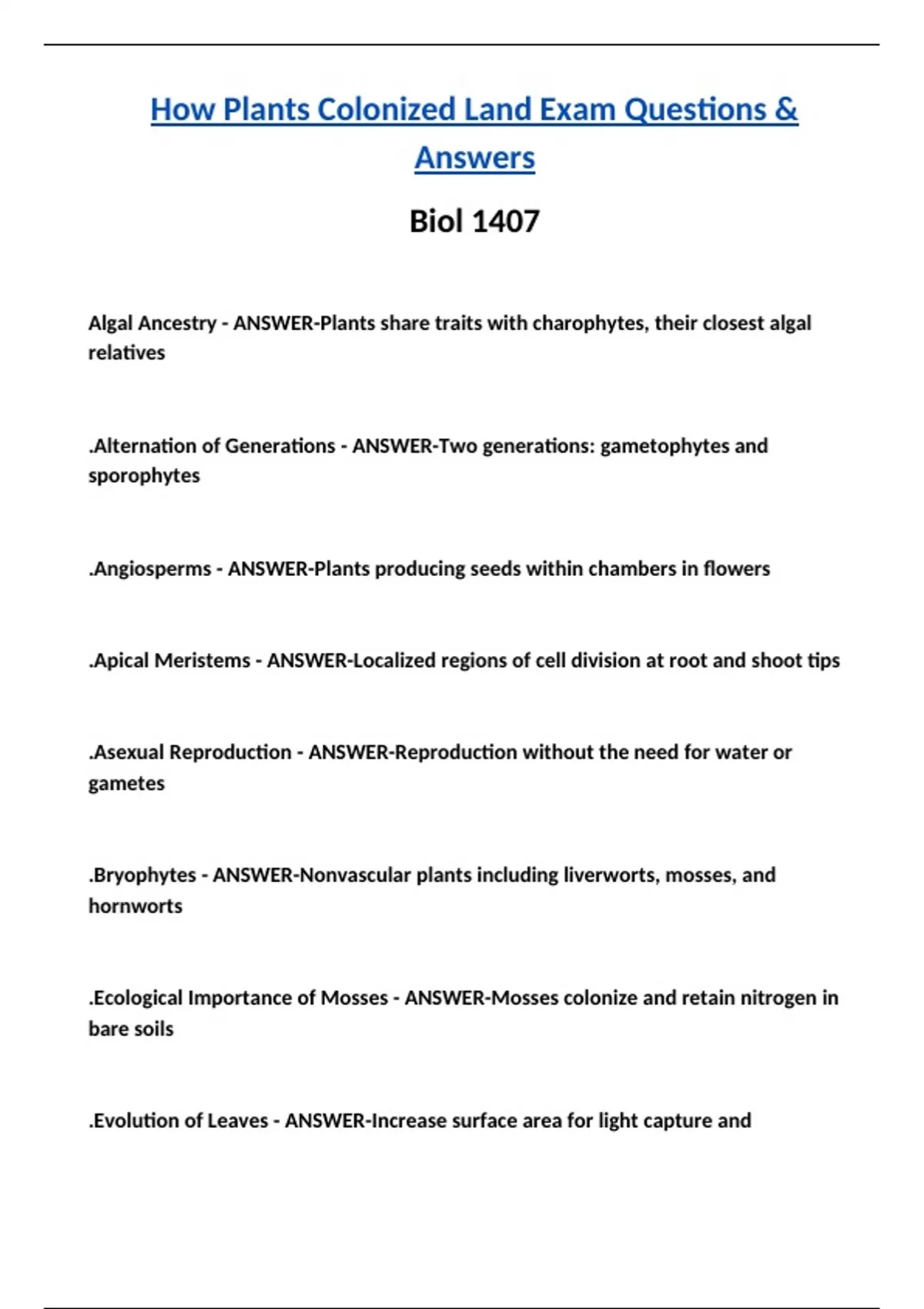 .Evolution of Roots - ANSWER-Organs that anchor plants and absorb water and