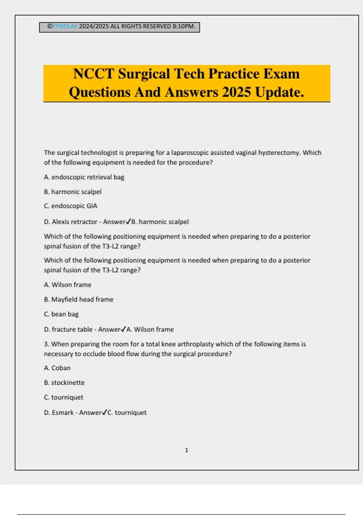©FYNDLAY 2024/2025 ALL RIGHTS RESERVED 8:10PM. 1 NCCT Surgical Tech Practice Exam Questions And Answers 2025 Update. The surgical technologist is preparing for a laparoscopic assisted vaginal hysterectomy. Which of the following equipment is needed for the procedure? A. endoscopic retrieval bag B. harmonic scalpel C. endoscopic GIA D. Alexis retractor - AnswerB. harmonic scalpel Which of the following positioning equipment is needed when preparing to do a posterior spinal fusion of the T3-L2 range? Which of the following positioning equipment is needed when preparing to do a posterior spinal fusion of the T3-L2 range? A. Wilson frame B. Mayfield head frame C. bean bag D. fracture table - AnswerA. Wilson frame 3. When preparing the room for a total knee arthroplasty which of the following items is necessary to occlude blood flow during the surgical procedure? A. Coban B. stockinette C. tourniquet D. Esmark - AnswerC. tourniquet ©FYNDLAY 2024/2025 ALL RIGHTS RESERVED 8:10PM. 2 The surgeon is starting an exploratory laparotomy on an elderly female patient with a very large rotund abdomen. Which of the following supplies should the surgical technologist have available in the room? A. Laparoscopic instruments and a Bookwalter retractor. B. Bowel instrumentation and a Bookwalter retractor. C. Laparoscopic instruments and a Balfour retractor. D. Bowel instrumentation and a Balfour retractor. - AnswerB. Bowel instrumentation and a Bookwalter retractor. Which of the following equipment is essential for a VATS procedure? (Select the three (3) correct answers.) A. Wilson frame B. bean bag C. video tower D. Jackson table E. pillows - AnswerB. bean bag C. video tower E. pillows The surgical team is in the midst of the Time Out Protocol with the OR charge nurse present to audit their briefing. After stating the procedure, site of procedure, antibiotics administered, patient history, patient name and everyone in the room agreeing to the briefing, the charge nurse declared it a failed briefing. Which of the following elements of a Time Out did the surgical team exclude? A. verification of the floor the patient will return to B. verification of blood type C. verification that the proper implants are in the room D. verification of the surgical consent form - AnswerC. verification that the proper implants are in the room Which of the following are verified in the Time Out process? (Select the three (3) correct answers.) A. patient's identity ©FYNDLAY 2024/2025 ALL RIGHTS RESERVED 8:10PM. 3 B. patient's blood type C. correct site D. procedure to be performed E. patient's date of birth - AnswerA. patient's identity C. correct site D. procedure to be performed The nurse initiates a surgical time out with the surgeon not present and states the wrong patient identifiers. Which of the following is the best action for the surgical technologist to take? A. Ask the nurse to repeat the time out once the physician is in the room. B. Report this sentinel event through the facility compliance hotline. C. Perform the time out with the correct patient identifiers. D. Allow the nurse to complete the time out. - AnswerA. Ask the nurse to repeat the time out once the physician is in the room. Which of the following is a special consideration before the procedure for a burn patient? A. amount of light in the room B. temperature of room C. laminar air flow rates D. type of operating room bed - AnswerB. temperature of room In an appendectomy where the patient is morbidly obese, which of the following self-retaining retractors is most appropriate to have on the sterile field? A. O'Sullivan-O'Connor B. Balfour C. Weitlaner D. Gelpi - AnswerB. Balfour When performing pediatric surgery, the temperature of the room must be adjusted before the patient enters approximately A. 30 minutes prior and between 75.6 and 78.8 degrees Fahrenheit. B. one hour prior and b