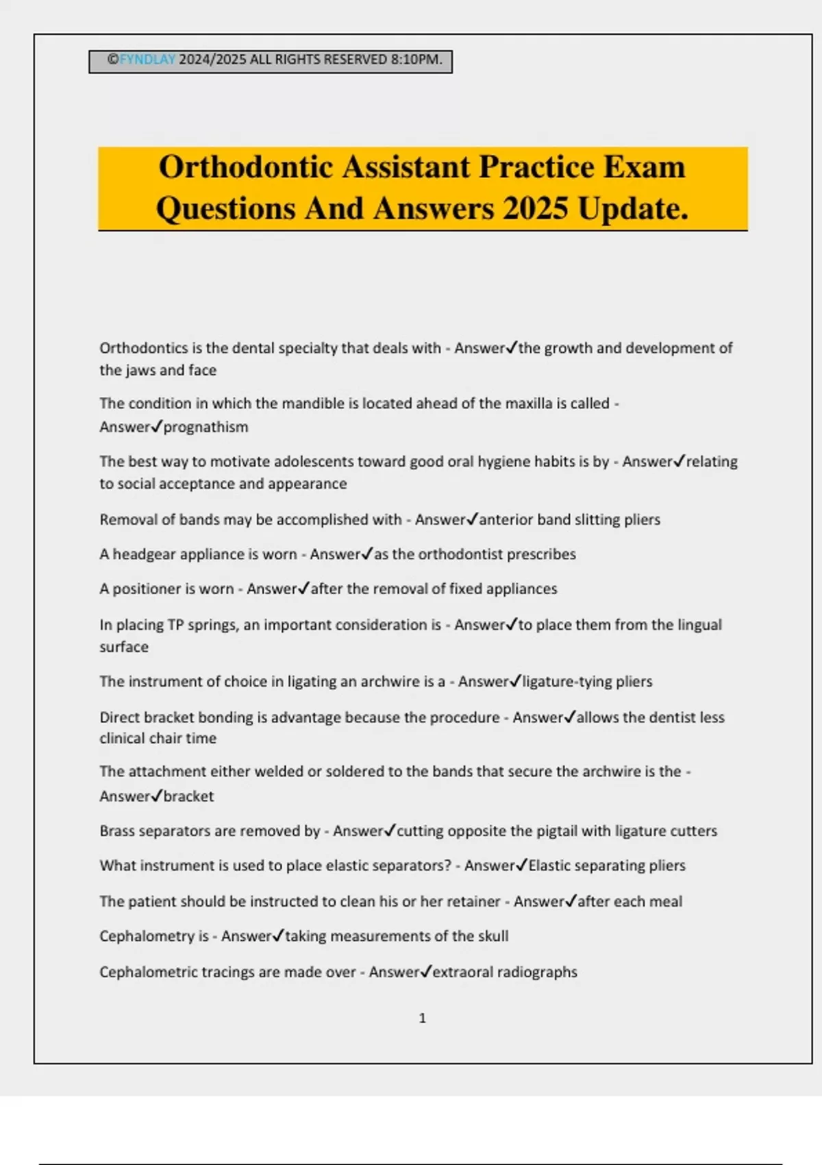 ©FYNDLAY 2024/2025 ALL RIGHTS RESERVED 8:10PM. 1 Orthodontic Assistant Practice Exam Questions And Answers 2025 Update. Orthodontics is the dental specialty that deals with - Answerthe growth and development of the jaws and face The condition in which the mandible is located ahead of the maxilla is called - Answerprognathism The best way to motivate adolescents toward good oral hygiene habits is by - Answerrelating to social acceptance and appearance Removal of bands may be accomplished with - Answeranterior band slitting pliers A headgear appliance is worn - Answeras the orthodontist prescribes A positioner is worn - Answerafter the removal of fixed appliances In placing TP springs, an important consideration is - Answerto place them from the lingual surface The instrument of choice in ligating an archwire is a - Answerligature-tying pliers Direct bracket bonding is advantage because the procedure - Answerallows the dentist less clinical chair time The attachment either welded or soldered to the bands that secure the archwire is the - Answerbracket Brass separators are removed by - Answercutting opposite the pigtail with ligature cutters What instrument is used to place elastic separators? - AnswerElastic separating pliers The patient should be instructed to clean his or her retainer - Answerafter each meal Cephalometry is - Answertaking measurements of the skull Cephalometric tracings are made over - Answerextraoral radiographs ©FYNDLAY 2024/2025 ALL RIGHTS RESERVED 8:10PM. 2 The cephalometric headplate taken most often is the - Answerlateral skull headplate An open bite refers to a condition wherein - Answerthe anterior teeth do not contact Overjet is the - Answerhorizontal distance between maxillary and mandibular teeth A type of measuring device commonly used to take intraoral measurments is a (an) - Answerflexible millimeter ruler When seating and sizing bands using a band pusher type of instrument, it is necessary to maintain control by - Answerestablishing a stable fulcrum before applying pressure Class III malocclusion is - Answera protruded position of the mandible in relation to the maxilla Vertical overbite refers to the - Answervertical overlap of the incisal edges of maxillary and mandibular anterior teeth Class II maloclussion is - Answerretruded position of the mandible in relation to the maxilla The head-stabilizing device used in cephalometrics is called a (an) - Answercephalostat During cementation of bands, the cement is placed - Answeron all surfaces within the band The attachment of anterior plastic brackets directly to teeth can be accomplished by - Answeracid etch bonding Cervical anchorage (headgear) is an - Answerappliance that exerts distal forces on maxillary teeth After active orthodontic treatment is finished , what appliance is used to stabilize the teeth? - AnswerA retainer When determining the length of a preformed archwire, you measure the distance from - Answerfirst molar to first molar In the removal of an archwire - Answerligature ties, then the archwire, are removed one side at a time from the buccal tube The most common type of removable retainer is a - AnswerHawley retainer What is used to tie the archwire onto orthodontic brackets? - AnswerLigature wire When removing separators, care must be taken to - Answeravoid injuring the interdental papillae A useful instrument for removing elas