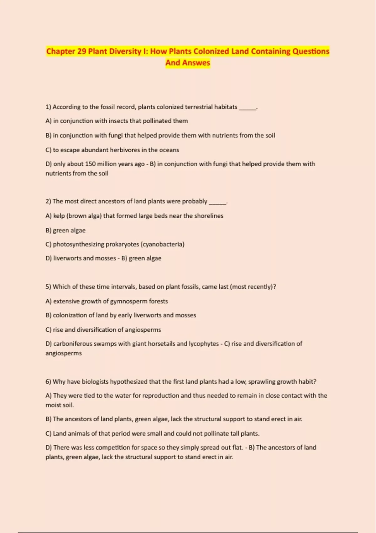 6) Why have biologists hypothesized that the first land plants had a low, sprawling growth habit?