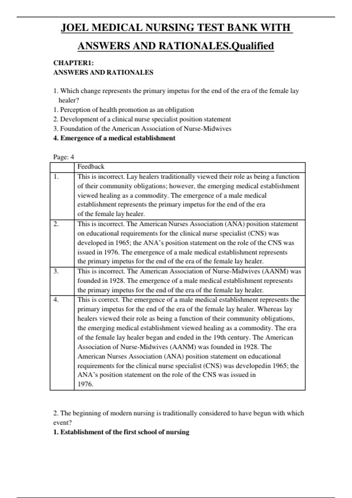 JOEL MEDICAL NURSING TEST BANK WITH ANSWERS AND RATIONALES. Qualified CHAPTER1: ANSWERS AND RATIONALES 1. Which change represents the primary impetus for the end of the era of the female lay healer? 1. Perception of health promotion as an obligation 2. Development of a clinical nurse specialist position statement 3. Foundation of the American Association of Nurse-Midwives 4. Emergence of a medical establishment Page: 4 Feedback 1. This is incorrect. Lay healers traditionally viewed their role as being a function of their community obligations; however, the emerging medical establishment viewed healing as a commodity. The emergence of a male medical establishment represents the primary impetus for the end of the era of the female lay healer. 2. This is incorrect. The American Nurses Association (ANA) position statement on educational requirements for the clinical nurse specialist (CNS) was developed in 1965; the ANA’s position statement on the role of the CNS was issued in 1976. The emergence of a male medical establishment represents the primary impetus for the end of the era of the female lay healer. 3. This is incorrect. The American Association of Nurse-Midwives (AANM)