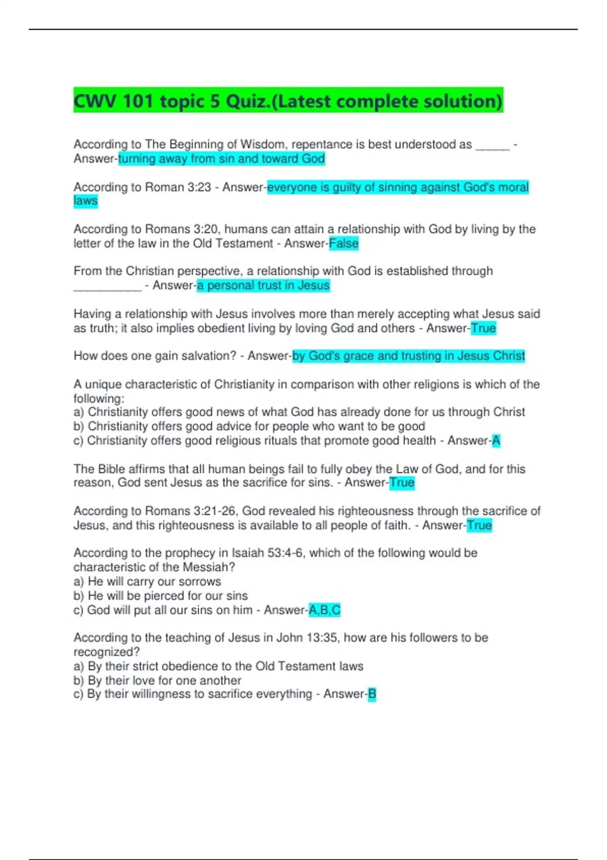 CWV 101 topic 5 Quiz.(Latest complete solution) According to The Beginning of Wisdom, repentance is best understood as _____ - Answer-turning away from sin and toward God According to Roman 3:23 - Answer-everyone is guilty of sinning against God's moral laws According to Romans 3:20, humans can attain a relationship with God by living by the letter of the law in the Old Testament - Answer-False From the Christian perspective, a relationship with God is established through __________ - Answer-a personal trust in Jesus Having a relationship with Jesus involves more than merely accepting what Jesus said as truth; it also implies obedient living by loving God and others - Answer-True How does one gain salvation? - Answer-by God's grace and trusting in Jesus Christ A unique characteristic of Christianity in comparison with other religions is which of the following: a) Christianity offers good news of what God has already done for us through Christ b) Christianity offers good advice for people who want to be good c) Christianity offers good religious rituals that promote good health - Answer-A The Bible affirms that all human beings fail to fully obey the Law of God, and for this reason, God sent Jesus as the sacrifice for sins. - Answer-True According to Romans 3:21-26, God revealed his righteousness through the sacrifice of Jesus, and this righteousness is available to all people of faith. - Answer-True According to the prophecy in Isaiah 53:4-6, which of the following would be characteristic of the Messiah? a) He will carry our sorrows b) He will be pierced for our sins c) God will put all our sins on him - Answer-A,B,C According to the teaching of Jesus in John 13:35, how are his followers to be recognized? a) By their strict obedience to the Old Testament laws b) By their love for one another c) By their willingness to sacrifice everything - Answer-B