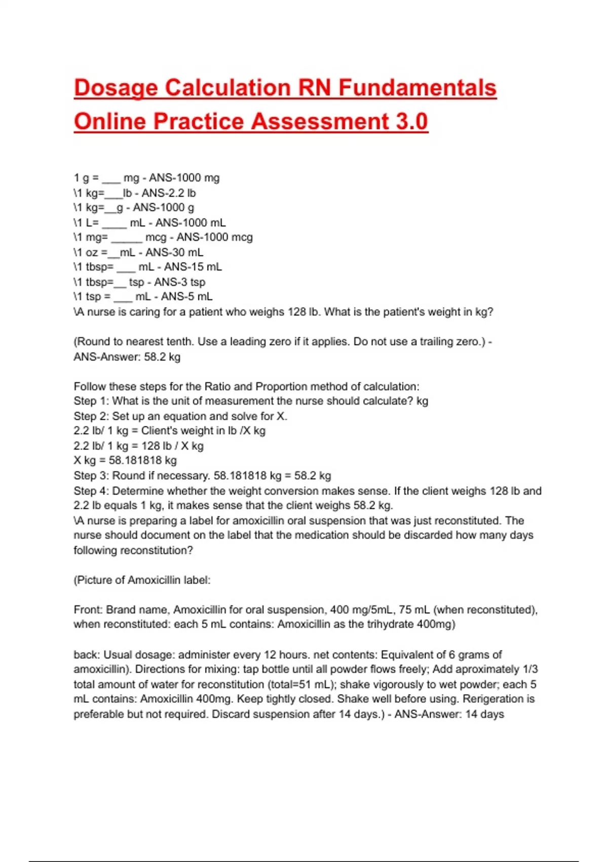 Dosage Calculation RN Fundamentals Online Practice Assessment 3.0 Test Bank Exam 2025/2026 Questions With Correct Answers.