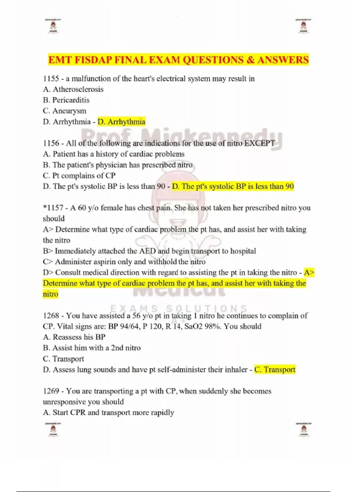 EMT FISDAP FINAL EXAM QUESTIONS & ANSWERS-1155 - a malfunction of the heart's electrical system may result in A. Atherosclerosis B. Pericarditis C. Aneurysm D. Arrhythmia - D. Arrhythmia 1156 - All of the following are indications for the use of nitro EXCEPT A. Patient has a history of cardiac problems B. The patient's physician has prescribed nitro C. Pt complains of CP D. The pt's systolic BP is less than 90 - D. The pt's systolic BP is less than 90 *1157 - A 60 y/o female has chest pain. She has not taken her prescribed nitro you should A> Determine what type of cardiac problem the pt has, and assist her with taking the nitro B> Immediately attached the AED and begin transport to hospital C> Administer aspirin only and withhold the nitro D> Consult medical direction with regard to assisting the pt in taking the nitro - A> Determine what type of cardiac problem the pt has, and assist her with taking the nitro 1268 - You have assisted a 56 y/o pt in taking 1 nitro he continues to complain of CP. Vital signs are: BP 94/64, P 120, R 14, SaO2 98%. You should A. Reassess his BP B. Assist him with a 2nd nitro C. Transport D. Assess lung sounds and have pt self-administer their inhaler - C. Transport 1269 - You are transporting a pt with CP, when suddenly she becomes unresponsive you should A. Start CPR and transport more rapidly B. Stop the ambulance and confirm absence of pulse C. Immediately apply an AED and analyze D. Insert an OPA and ventilate twice - B. Stop the ambulance and confirm absence of pulse 1271 - __________________ is a cardiac arrhythmia characterized by a complete disorganization of electrical activity A. Ventricular tachycardia B. Pulseless electrical activity C. Ventricular fibrillation D. Atrial fibrillation - C. Ventricular fibrillation 1273 - One of the most problematic side effects of nitro is A. Hypotension B. Bradycardia C. Angina D. Dyspnea - A. Hypotension 1278 - The strongest portion of the heart that is responsible for circulating blood to the entire body is the A. Left atrium B. Right atrium C. Left ventricle D. Right ventricle - C. Left ventricle 1279 - You are dispatched to a 68 y/o female complaining of discomfort in her upper back. She is nauseous and appears to be sweaty. Based on these symptoms, which of the possible causes is most life-threatening. A. Stroke B. Diabetic reaction C. Cardiac compromise D. Indigestion - C. Cardiac compromise