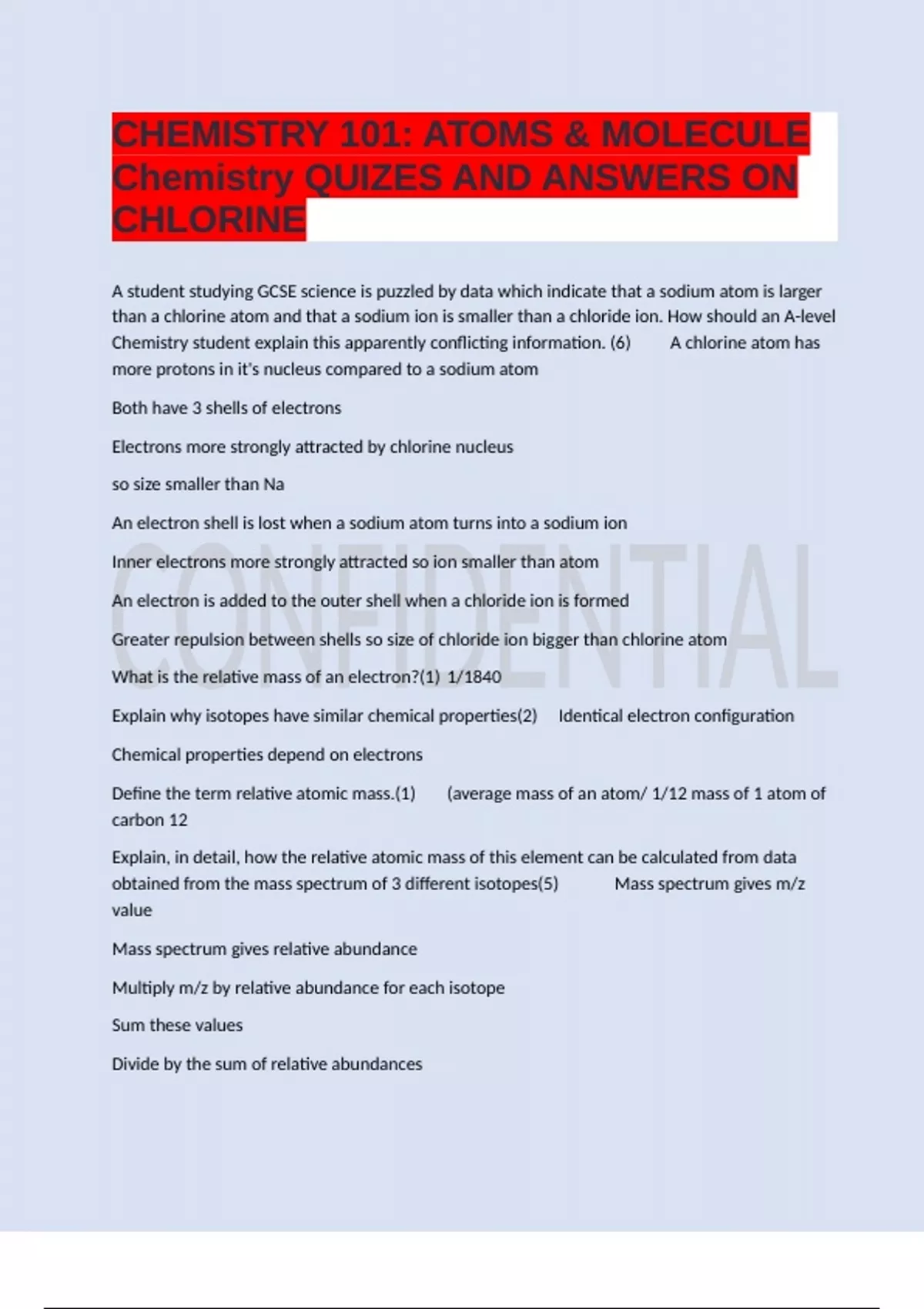 CHEMISTRY 101: ATOMS & MOLECULE Chemistry QUIZES AND ANSWERS ON CHLORINE