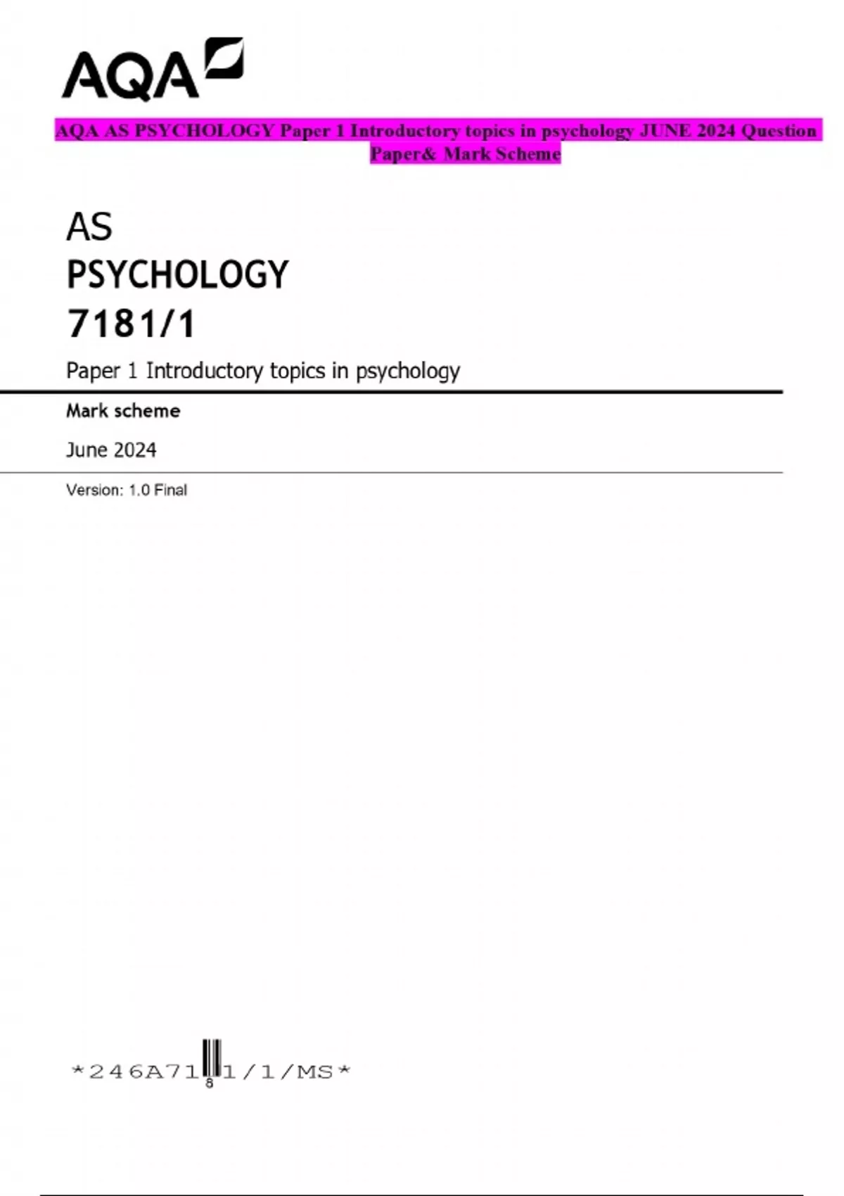 AQA AS PSYCHOLOGY Paper 1 Introductory topics in psychology JUNE 2024 Question Paper& Mark Scheme
