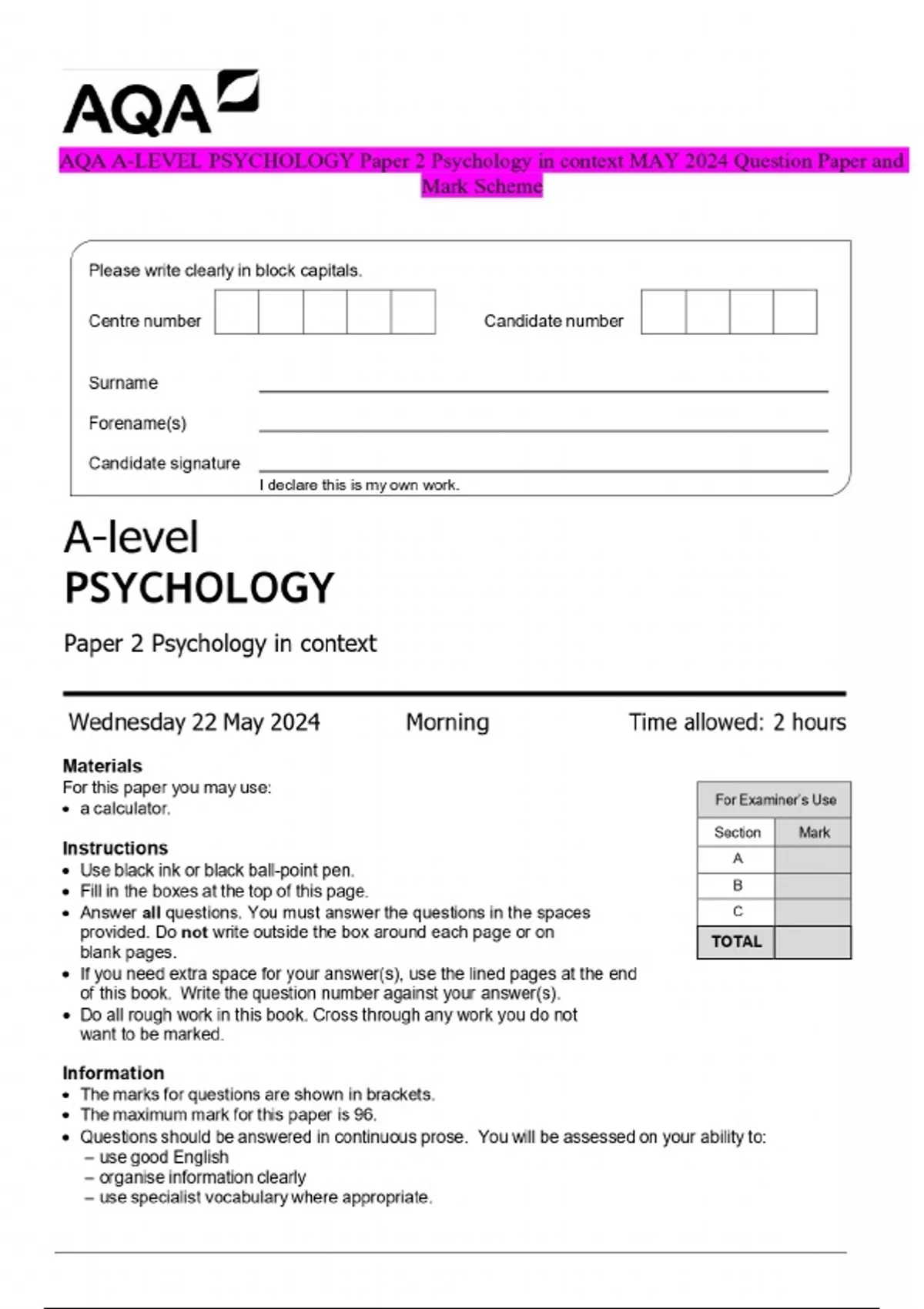 AQA A-LEVEL PSYCHOLOGY Paper 2 Psychology in context MAY 2024 Question Paper and Mark Scheme