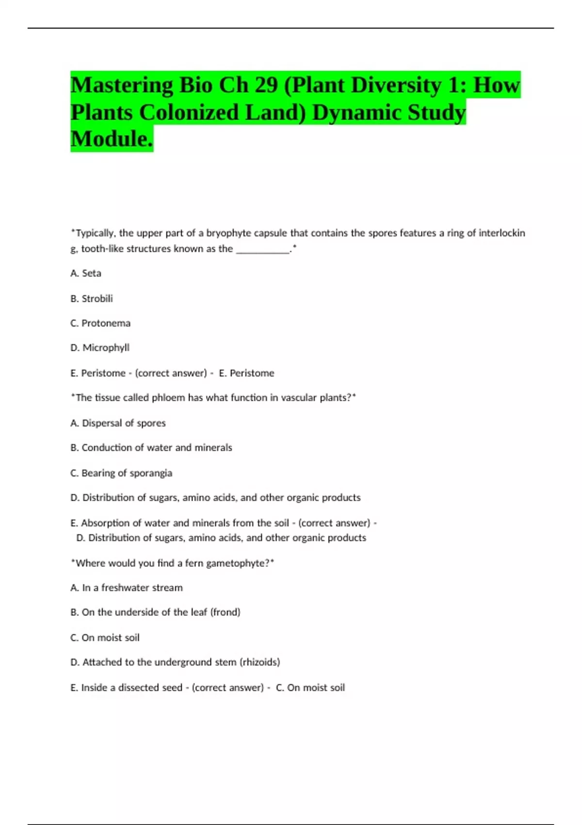 E. Gametophytes - (correct answer) - A. Vascular tissue