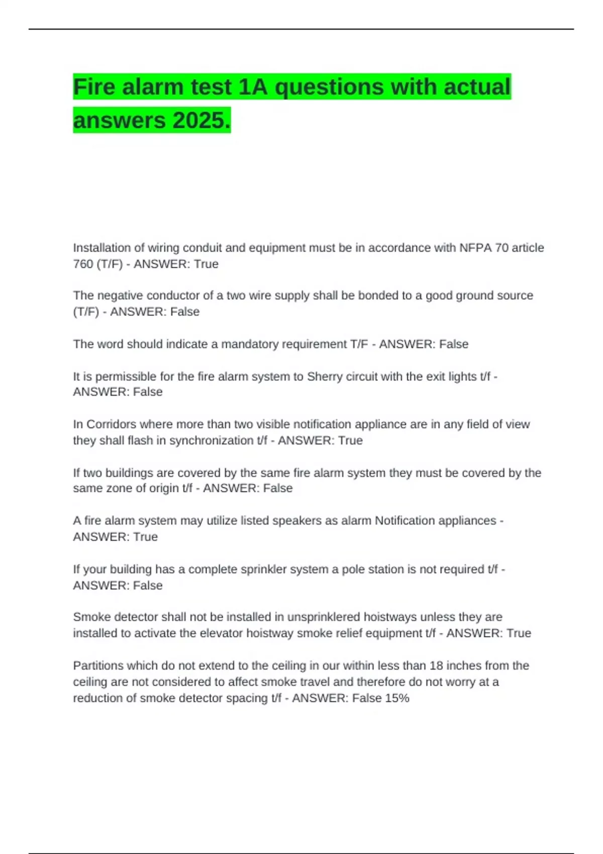 Fire alarm test 1A questions with actual