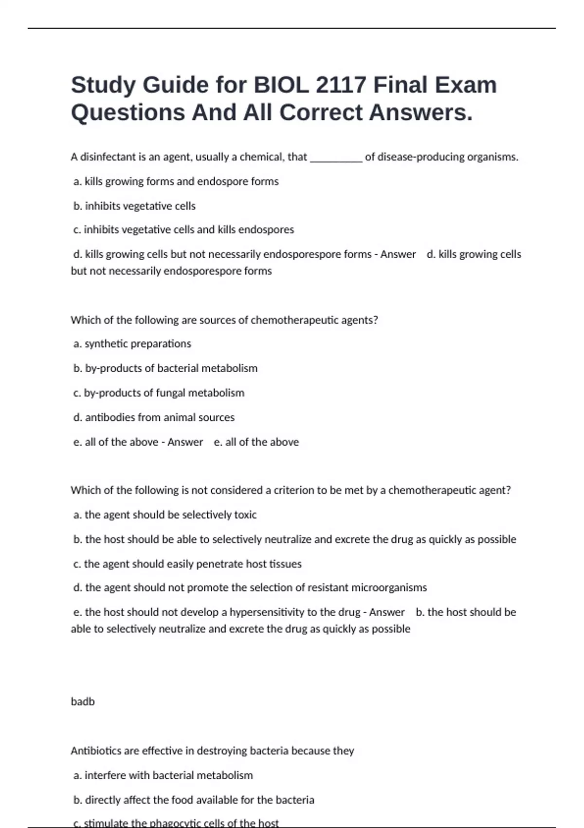 d. kills growing cells but not necessarily endosporespore forms - Answer d. kills growing cells