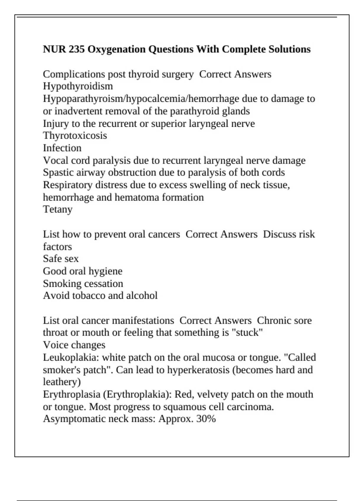 List oral cancer manifestations Correct Answers Chronic sore