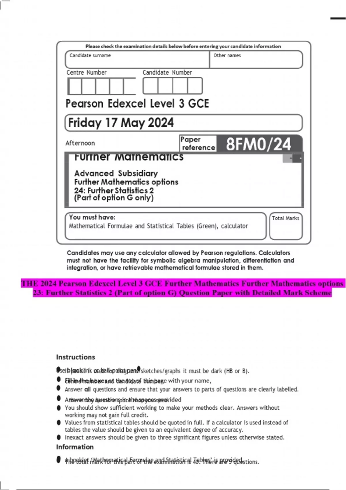 THE 2024 Pearson Edexcel Level 3 GCE Further Mathematics Further Mathematics options 23: Further Statistics 2 (Part of option G) Question Paper with Detailed Mark Scheme