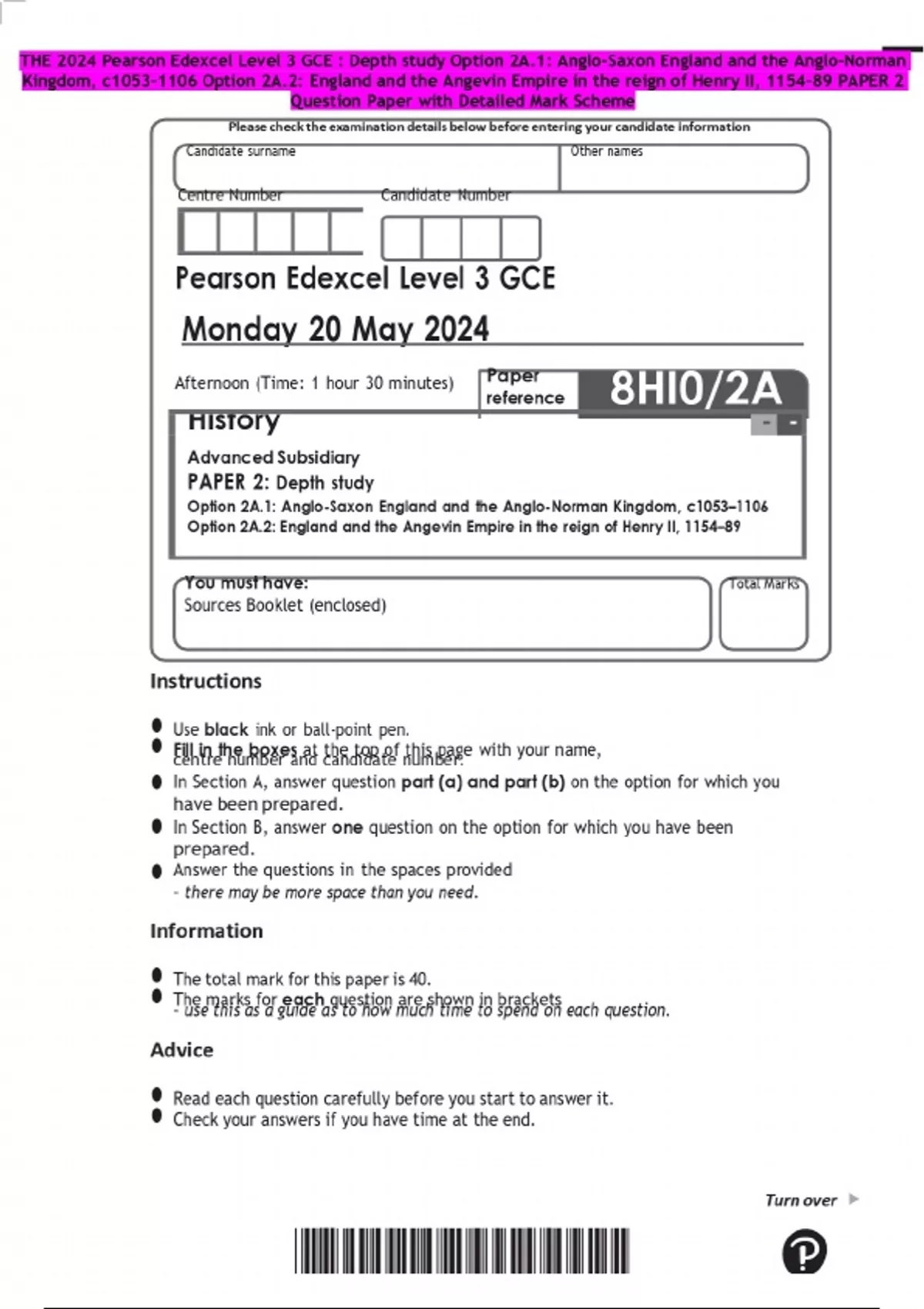 THE 2024 Pearson Edexcel Level 3 GCE : Depth study Option 2A.1: Anglo-Saxon England and the Anglo-Norman Kingdom, c1053–1106 Option 2A.2: England and the Angevin Empire in the reign of Henry II, 1154–89 PAPER 2 Question Paper with Detailed Mark Scheme