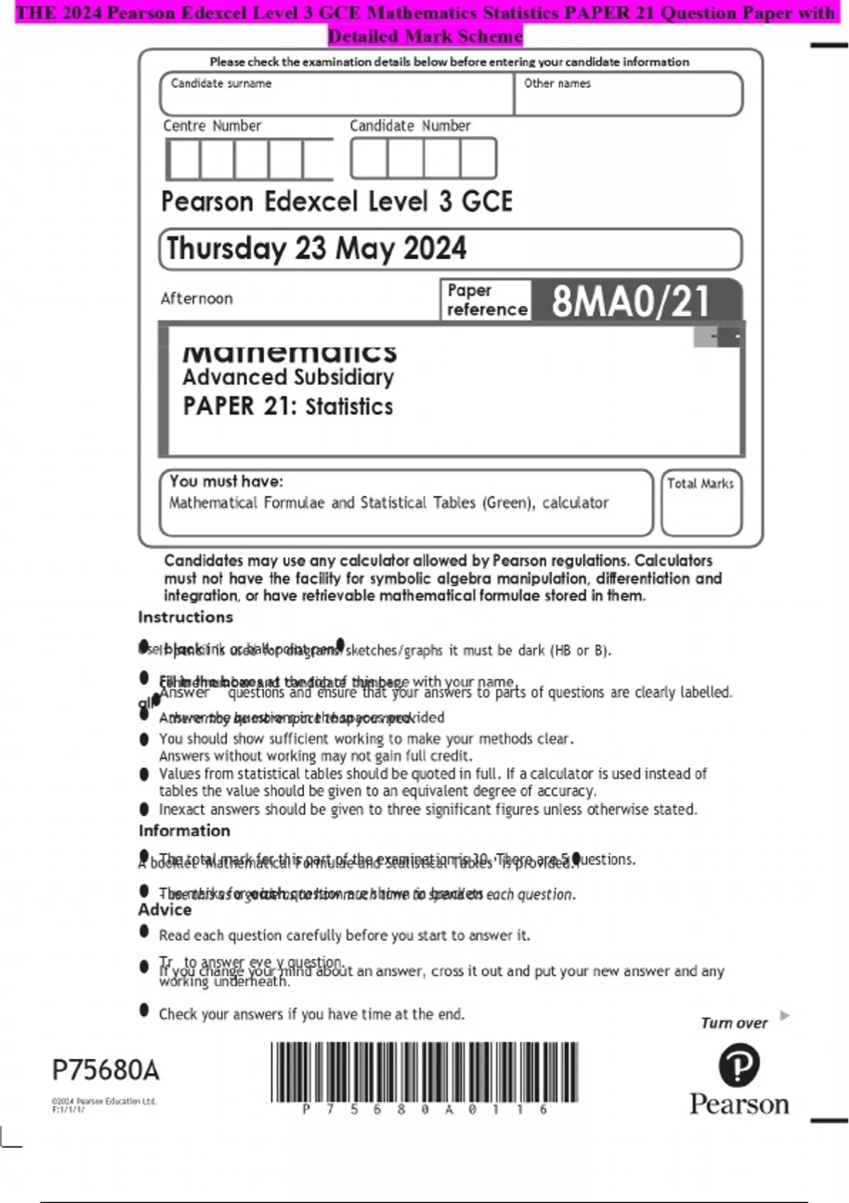THE 2024 Pearson Edexcel Level 3 GCE Mathematics Statistics PAPER 21 Question Paper with Detailed Mark Scheme