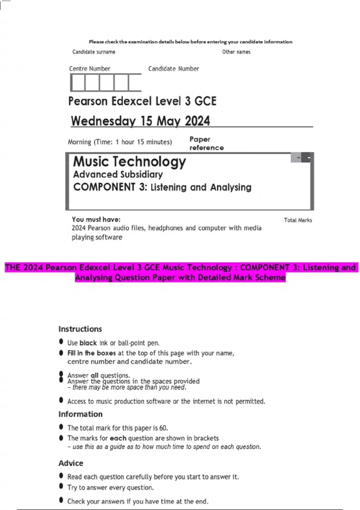 THE 2024 Pearson Edexcel Level 3 GCE Music Technology : COMPONENT 3: Listening and Analysing Question Paper with Detailed Mark Scheme