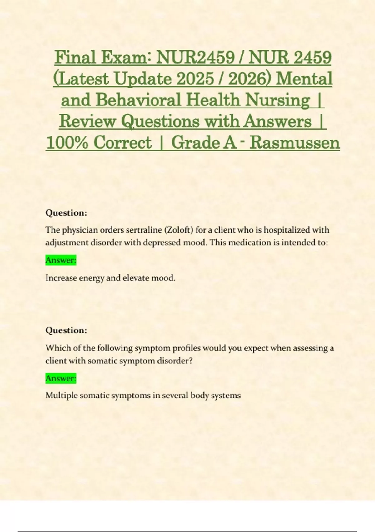 Final Exam: NUR2459 / NUR 2459 (Latest Update 2025 / 2026) Mental and Behavioral Health Nursing | Review Questions with Answers | 100% Correct | Grade A - Rasmussen